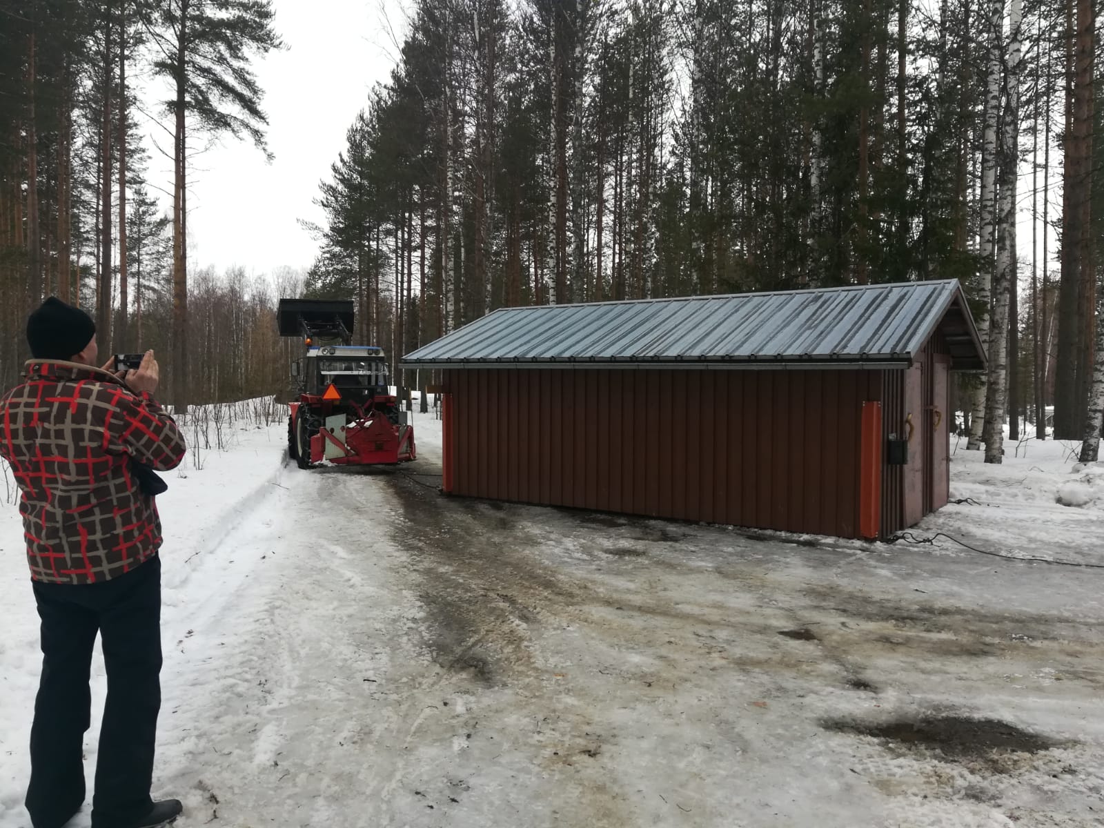 Autotallin siirto kokonaisenaSiirsimme pojan autotallin kokonaisena.Matkaa noin 1.5km. Leveyttä rakennuksella noin 3,6m ja räystäät 2x0.6m=4,8m Pituutta rakennuksella +7m ja tien leveys 3.5m? kuva 1.siirtovalmistelut 2.siiretty 100m ekana päivänä 3.lähtö 1,5km siirtoon 4.vetosuunta jo kääntynyt ja saapuu kotiin. Alkaa jo avoimien ovien päivä