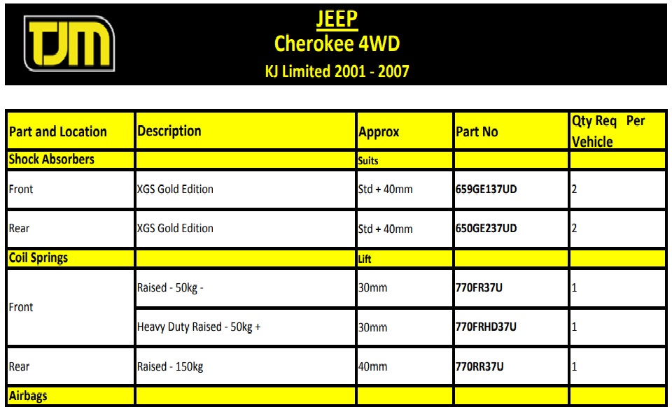 TJM Korotusjouset Jeep Cherokee KJ 2001-2007Myyty TJM Korotusjouset Jeep Cherokee / Liberty (KJ) 2001-2007Uudet ja käyttämättömät. Aussilaatua. Etujouset on HD-mallia, eli sopii dieselmoottorisiin tai muuten painavammalle keulalle. Valmistajan ilmoittama 30/40mm korotus on ensimmäiseen vuosimalliin, joka oli jo tehtaalta vähän korkeampi. Myöhempiin malleihin korotus on n. 50mm. TJM XGS Equipped 770FRHD37U Etujouset oikea ja vasen Constant Load: 50kg+ Finish: Powder coated yellow Fitment: Front Free Height: 375mm Wire Diameter: 16.5mm 30mm Linear TJM XGS Equipped 770RR37U Takajouset oikea ja vasen Constant Load: 150kg Finish: Powder coated yellow Fitment: Rear Free Height: 320mm Wire Diameter: 15mm 40mm Linear Hinta 240,- Nouto Tuusula/Järvenpää Tai jos on joustava aikataulu, niin kulkeutuu kyydissäni jonnekkin pääkaupunkiseudulle. 0 4 0 0 7 0 5 7 5 9 ismo [piste] 2020 [at] ipaco [piste] fi Myyty Viimeksi muokannut Iippi : 04.11.2020 19:22 |