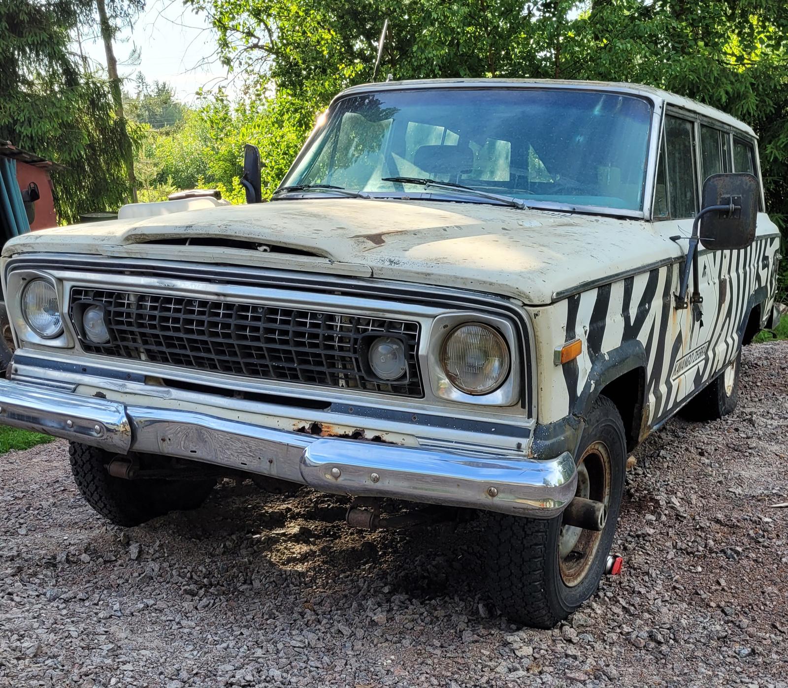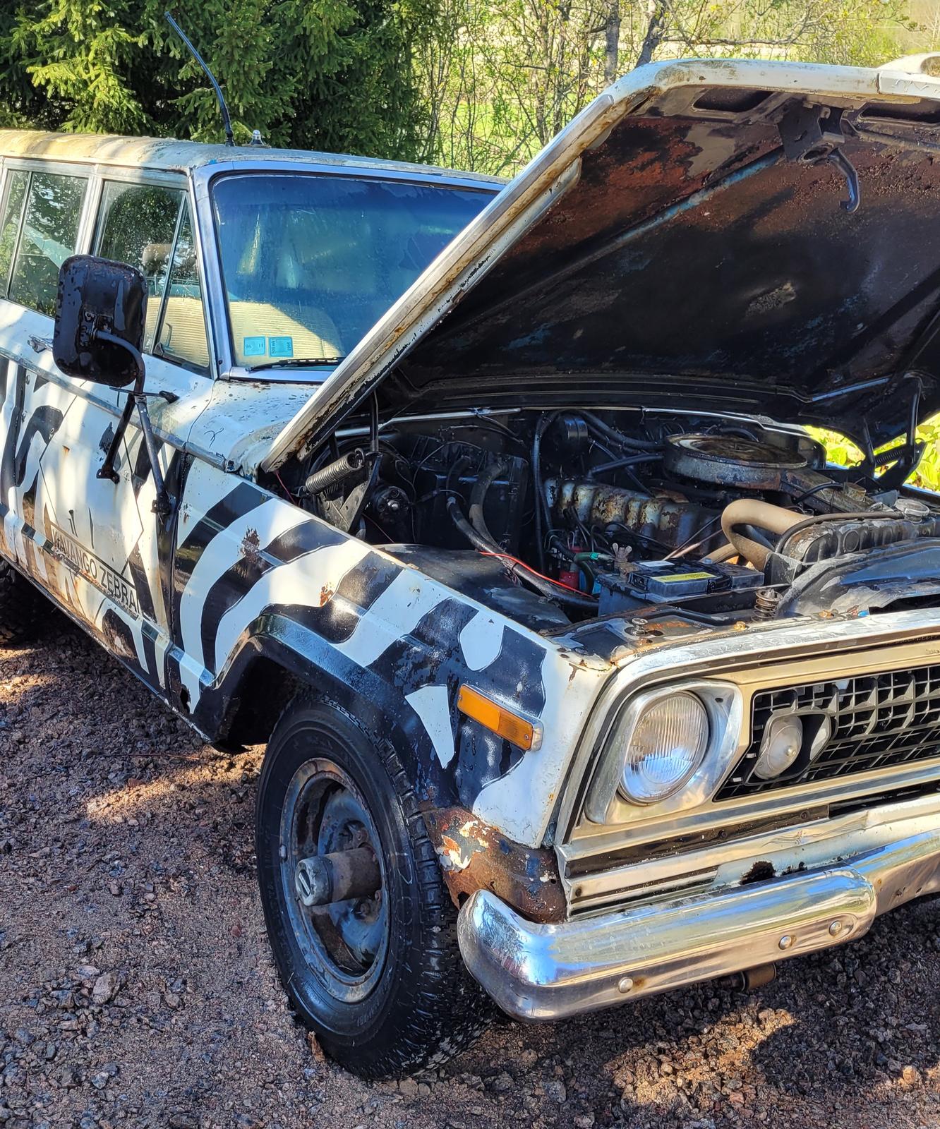 Jeep Wagoneer -78Eksyi pihan tuommoinen wagoneeri, vanha SA auto ja tuotu ulkomailta? Ainakin yksi edeltävistä omistajista kehui, että namibiassa ollut käytössä. Joskus ysärillä maalattu seepra kuvio, tyylikäs kokonaisuus siis. Mätää on runsaasti, aika pahasti päässyt pehmenemään osa koteloista samoin takaluukku, kuskin lattiasta tietoakaan ja niin edelleen. Moottori ainakin käy pullo bensalla, jarrut jumissa yms. Korin täytyisi nostaa pois rungolta ja katsoa mitä tästä kannattaa tehdä, tieliikenteeseen kyllä kiinnostaisi saada takaisin. Tekniikkana 4.2l suora 6 ja laatikko kolmelovinen manuaali, en kyllä vielä tielle päässyt kokeilemaan kun jarruja ei ole. Diiselöinti voisi olla mahdollinen mikä taitaa vielä onnistua poikkeusluvalla. Valmetti tai joku fiat kuorma-auto moottori, sekä joku järkevämpi laatikko kiinnostaa jos jollain semmoinen tekniikka on jemmassa? Tuo bensakone ei itseä niin sytytä jos jollain sellaiselle on tarvetta niin täältä semmoinen löytyy, tai vaikka koko autolle Auton rekisteritiedoissa luki jarrulliseksi vetomassaksi 5900kg?? Taitaa olla tullut kirjoitusvirhe vaikka se trafin sivuilla lukee, vai onko armeijan autoilla saanut jotain kranaatinheitintä vedellä? Päivittelen tänne kun etenee ja mitä autolle tulee tehtyä. Yksi projekti ainakin on vielä ennen hitsattavaa ennen kuin tähän on aikaa sen suuremmin käydä käsiksi