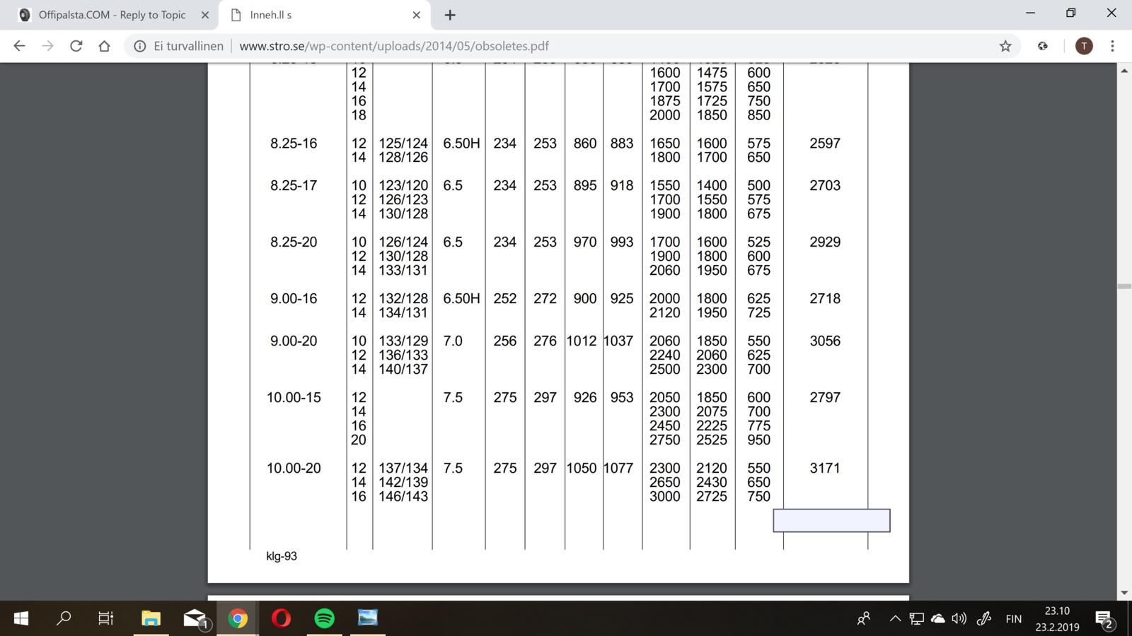 Liitteenä kuva rengasvaihtoehdoista. Kelpaako tähän autoon verrokiksi 10.00-15? STRO:n taulukon mukaan renkaan koko milleinä on 926mm. Muut koot on huomattavasti pienempiä. 10-15 LT on 773mm mutta jos pilkkua nussit**n niin STRO:n taulukon mukaan koko olisi 926mm. Onko tässä joku virhe taulukossa vai saako tähän lain puitteissa otteeseen todella isot renkaat?
