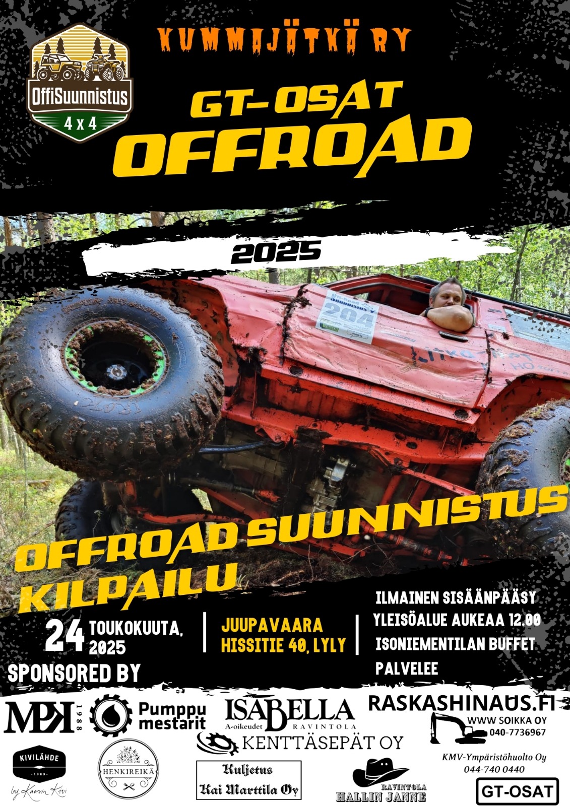 GT-Osat Offroad 24.5.-25Tervetuloa GT-Osat Offroadiin Juupajoelle! Tapahtuma kuuluu Off-Road Suunnistus -CUP-sarjaan ja ajetaan cupin säännöillä. Erityistä huomiota kiinnitetään ajoalueiden rajojen noudattamiseen, lippusiimojen venyttämiseen, puustovaurioihin sekä rastikuvien ottamiseen. Mönkijöiden osalta kuvasta on selvästi käytävä ilmi, että kuva on otettu joukkueen toisen jäsenen toimesta. Ajoneuvoilla etsitään maastosta rasteja GPS-laitteen avulla. Rastien löytäminen ei siis ole hankalaa, vaan haaste tulee rastin lähelle pääsemisestä. Jokaisesta rastista pitää ottaa kuva, jossa näkyy selkeästi auton kilpailunumero tai rekisterinumero sekä rastin numero ja käsikosketus! Ajoneuvo pitää saada niin lähelle rastia, että kuljettaja tai apukuljettaja ylettyy samaan aikaan koskettamaan rastikylttiä sekä autoaan käsin. Joukkueella tulee olla mukana oma muistikortillinen kuvausväline, kamera tai puhelin. Kameran muistin olisi hyvä riittää ottamaan n.250 kuvaa resoluutiolla 1024×768. Mikäli muistikortin kapasiteetti ei kuitenkaan riitä, on se mahdollista käydä purkamassa kilpailutoimistolla. Rastit on pisteytetty vaikeusasteen mukaan. Mukana saattaa olla myös ”vaarallisia rasteja”, joissa käytettävä omaa harkintaa turvakaarettomilla kulkuneuvoilla. Jokaiselle luokalle on samat rastit. Aika: 23.-25.5.2025 Paikka: Juupajoki Järjestäjä: Kummajätkä ry Ajettavat luokat: Mönkijät (1-mönkijä rastille -sääntö) Autot Pikkupyöräiset Autot Isopyöräiset Avoin luokka (sis. UTV-ajoneuvot) Safari Kilpailun kesto: 13 tuntia. Kilpailukeskus: Särkikankaan moottorirata Särkikankaantie 70 35530 Lyly Kulmapisteet: N 61° 53.400’, E 024° 13.600’ N 61° 53.900’, E 024° 38.200’ N 61° 45.900’, E 024° 38.700’ N 61° 45.500’, E 024° 14.300’ Ilmoittautuminen: Osallistumismaksu: 150€/pari/auto. Safari 100€ Viimeinen ilmoittautumispäivä: 17.05.2025 klo 23.59 Ilmoittautuaksesi täytä ilmoittautumiskaavake täältä: https://offisuunnistus.fi/index.php/...tka-juupajoki/ Osallistuminen maksetaan Kummajätkä ry:n tilille: FI5855210720135507 Maksun tulee näkyä tilillä 18.05. tai ilmoittautuminen katsotaan jälki- ilmoittautumiseksi! Viestikenttään GT-Osat Offroad-25 / tiimin nimi Ilmoittautumisen yhteydessä ilmoita kokosi kisapaitaa varten (2kpl/tiimi), sekä montako henkilöä/tiimi on tulossa kisapaikalle. Ilmoittakaa myös, mikäli tiedätte ostavanne paitoja muille tiimin jäsenille. Jälki-ilmoittautuminen 180€/joukkue Aikataulu: Perjantai 23.5. 17.00-22.00 ilmoittautuminen ja katsastus Lauantai 24.5. 6.30 Ilmoittautuminen ja katsastus (tarvittaessa, ilmoitattehan etukäteen.) 7.30 Ohjaajakokous 8.00 Lähtö 12.00-16.00 Yleisöalue 21.00 Maali Sunnuntai 25.5 09.30 Tulosten julkaisu 09:30-10:00 Protestiaika 10.00 Palkintojen jako Muuta: Majoitusta löytyy yhteistyökumppaniltamme Majatalo Henkireiästä 30 paikkaa, sekä muutamia asuntoauto/-vaunupaikkoja. Tarjolla myös aamu/-iltapalaa sekä sauna. www.henkireika.fi. Booking.com kautta löytyy myös Majatalo Kuusela Mäntässä, josta löytyy majoituspaikkoja. Mäntän ja Oriveden keskustoista ajaa moottoriradalle n.30min, joten majoitusta voi kysyä myös kaupunkien hotelleista. Kilpailukeskuksessa on tilaa asuntoautoille sekä isommalle kuljetuskalustolle. Pieni ja isopyöräiset siirtyvät alueelta toiselle ajamalla. Mönkijät ja avoinluokka trailerisiirrolla, paitsi jos ajoneuvo on tieliikennekelpoinen (katsastettu), niin silloin voi siirtymät myös ajaa. Siirtokilvelliset aina trailerilla. Yksityisteiden käyttö on kielletty ja tätä tullaan valvomaan! Safariluokka: – Safariluokka on lajiin tutustuville ja kokeilemaan lähteville tiimeille suunnattu luokka. – Safarissa lasketaan tulokset, mutta palkintoja ei jaeta. Jos kysyttävää ilmenee, ota yhteyttä: kummajatka.ry@gmail.com Kilpailunjohtaja: Kummajätkä ry / Juha Järvinen 0456483413 Maisemat ovat Juupajoella erinomaiset, yleisöalueella sijaitseva Venäläisvuori on Pirkanmaan korkein paikka, kohoten 233 metriä merenpinnan yläpuolelle. Huipulla pääsee käymään ![]() Nähdään paikanpäällä! -Jani Lylyoja