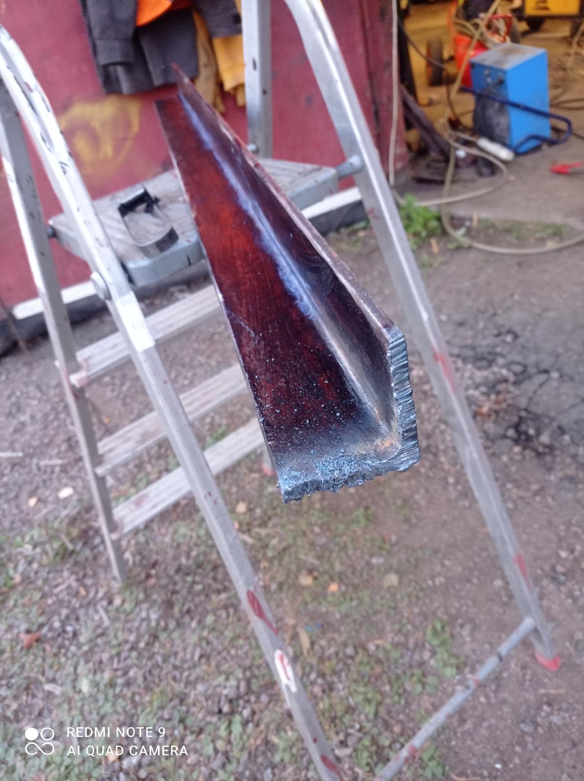 Helman korjauspala leikattu. Täytyy sanoa että olen suht tyytyväinen tuohon leikkuu jälkeen. Vapaalla kädellä leikkasin. Tää on sen verran paksua että mukavampihan se on pillillä leikata kun rälläkällä. Joku saattaa miettiä että miksi teen helma"palkin" kulmaraudasta enkä oikeasta palkista, niin jätän sen takaseinän kun siellä on ne korin kannakkeet yms, teen tarvittaessa lisää tukea. Tällästä materiaalia oli myös hyvin saatavilla ja on koon puolesta just Passeli niin ei tarvi muuta kuin leikkaa ja hitsata kiinni. En ole kuitenkaan aikeissa tunkatakkaan tuosta helmasta. Jos se takaseinä joskus ruostuu ihan puhki. Niin teen sitte koko paskan uusiksi ja nostan korin rungolta sun muuta...