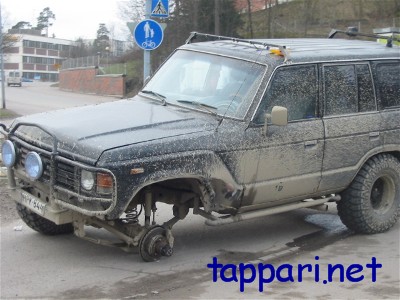 Itellä kävi tuolleen viime talvena. 37" mutsillat oli pikkasen liikaa vanhoille 8" mangelseille, niin pulttikehä murtu irti ja etunen tipahti. Mutterit oli kyl edelleen tiukalla navassa, mutkun vanteesta lähti keskeltä palanen irti :P Kuviakin on mula ehket jossain....
