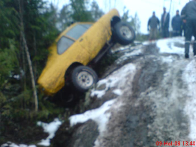 Finland trophy 2008: Patrollista oli laturi sanonu ittensä irti ja latas sen verran että vinssaamaan pysty n.10sek kerrallaan ,kunhan ensin lataili jonkun aikaa. No siinä kerran vaihettiin toinen akku, koska eihän meillä urpoilla kahta akkua sentään ollu mukana. Ja sitten joku hirveä oikosulku iski ja pyyhkästiin siellä louhoksen takana johonkin todella syvään mutaspooriin klo 11.30 yöllä. Siellä mutaspoorissa teutaroitiin n.100m ja saatiin 10p ja kerran katkes vinssinaru, koska edessämme oli noin 5-10 kuutiota mutalillinkiä ja spoori takanamme olis ollu tyhjä kun se kaikki skeida kulki meiän auton edellä. mutta ei vaan tullu kuitenkaan jostain kumman syystä edes mieleen kääntyä takaisin