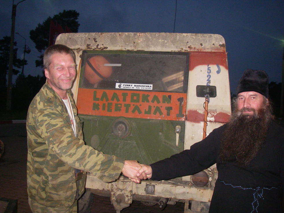 Ollessamme Käkisalmen huoltsikalla rupesi paikallinen väestö kieppumaan Volvon ympärillä,kumartelivat ja katselivat auton akseleita yms.Eräässä autossa olikin mukana tuollainen partasuu munkki joka myös tuli Volvon luo ja kehuskeli harasoo masiina ja muuta sellaista,kysyin voinko ottaa kuvan Miehestä ja Volvosta kun yksi muu heppu tuli ja näytti että yhdessä volvonluo ja kuvia hänen ottamanaan ja kättelyä ym..Samalla saimme siis siunauksen Laatokan kiertäjien toimintaan!!!