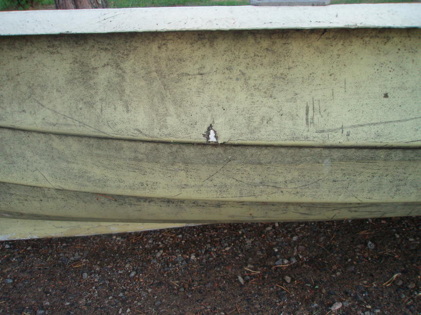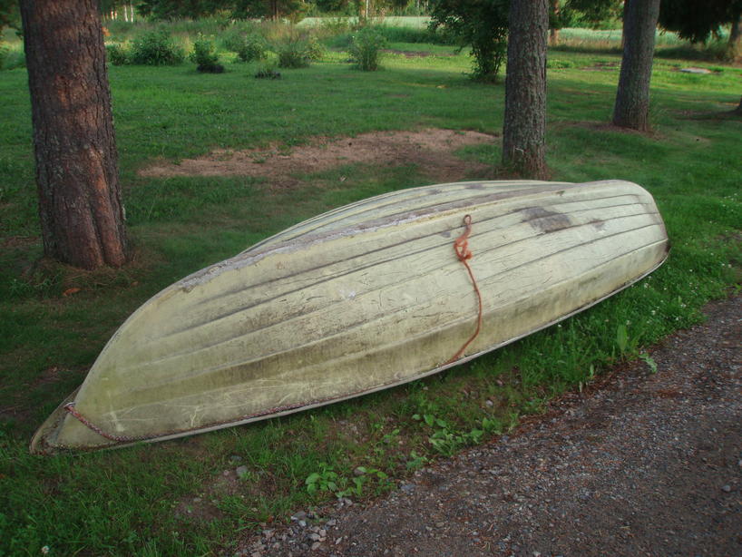 tuohon minä sen viime syksynä massikalla ja heinähännällä hajin lammesta, siinä kokokesän siirrelly ruohonleikkurin edessä, kun ei se ylikään mee, kokeilin kyllä, lopputuloksena löysin painepesurin sen alta. iteppähän sen sinne sateen alta edellisviikolla lykkäsin, ettei mee pilalle. ostakaapa joku tästä vene niin pääsen painepesuri ostoksille... kele!!!