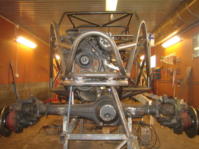 Laita Timo isommat renkaat ainakin eteen ja käännä tuo etuakseli niinpäin, että porttaalit osoittaa ylöspäin, sopii pinioni hyvin pyöriin, tai ei toi ookkaan hyvä idea kun sithän se akseli taitais pyöriä väärään suuntaan, sori.