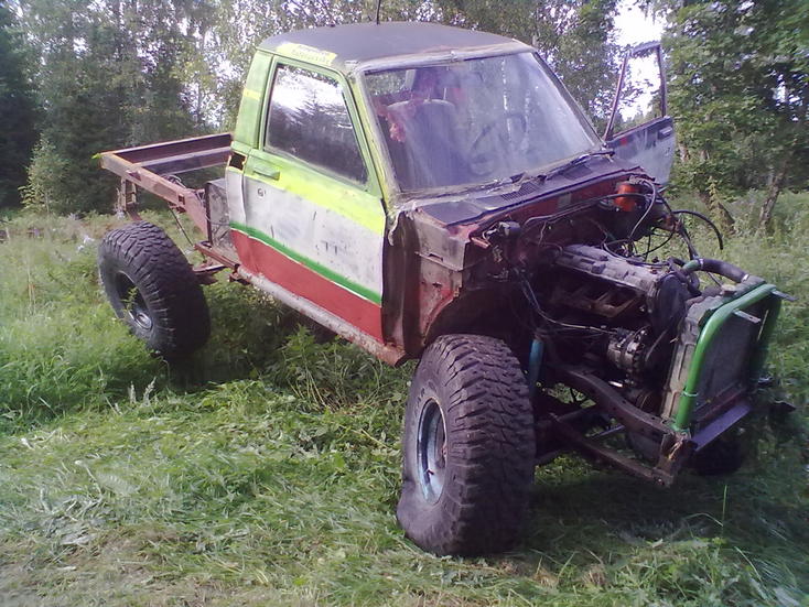 Tähän löytyy vielä takaa lyhennetty lava, keulan pellit, konepelti, loksut ja korin etu osa.