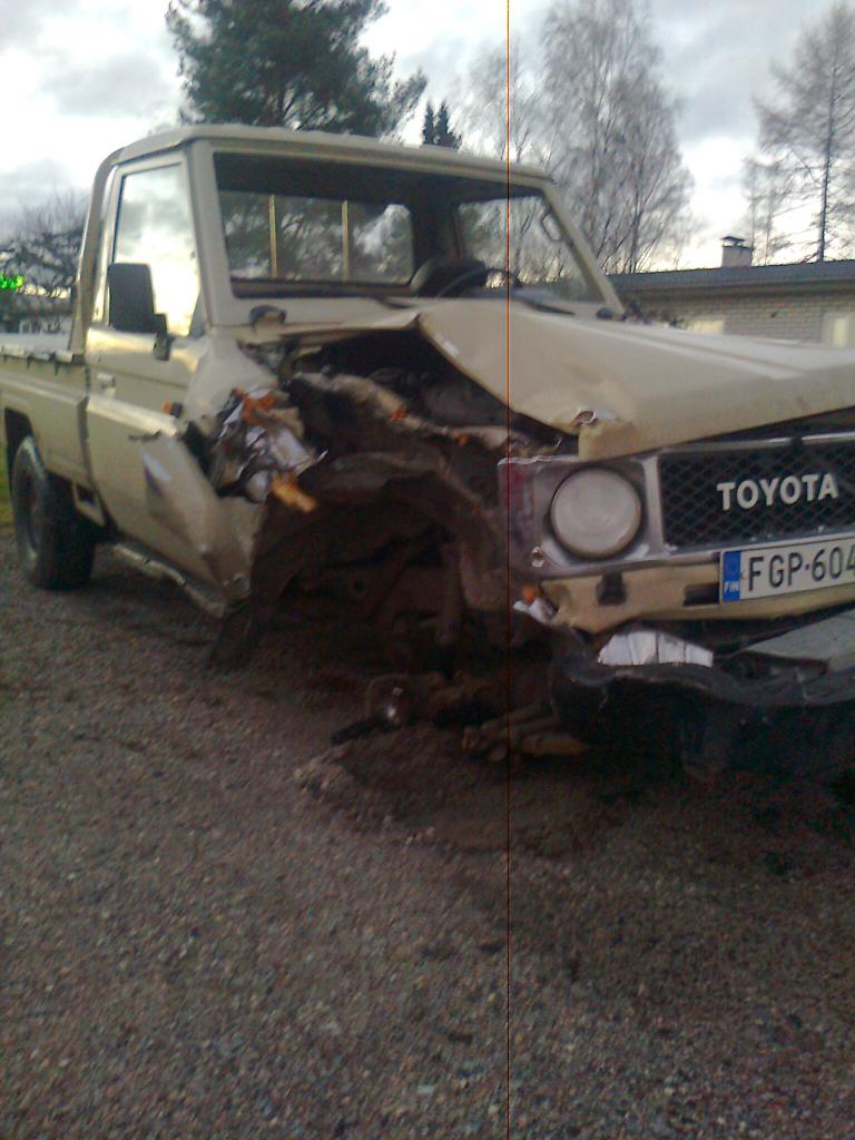 Tojo LC BJ75 Pickup -88Jos panis tästä vähän tarinaa nyt kun on saatu suurinpiirtein valmiiks ja todettu toimivaks. 2013 joulukuus, perjantai 13. päivä aamulla kun tulin töihin, odotti pihalla surullinen näky. Olt vähän lipsahtanu tieltä ja ottanu osumaa puun kanssa. Oikeenpuolen runkopalkin ulkopuolelta oli onnenks menny, eikä palkkien välistä tai kuskinpuolelta, eli suuremmilta henkilövahingoilta vältyttiin eikä runko ottanu isompaa osumaa.