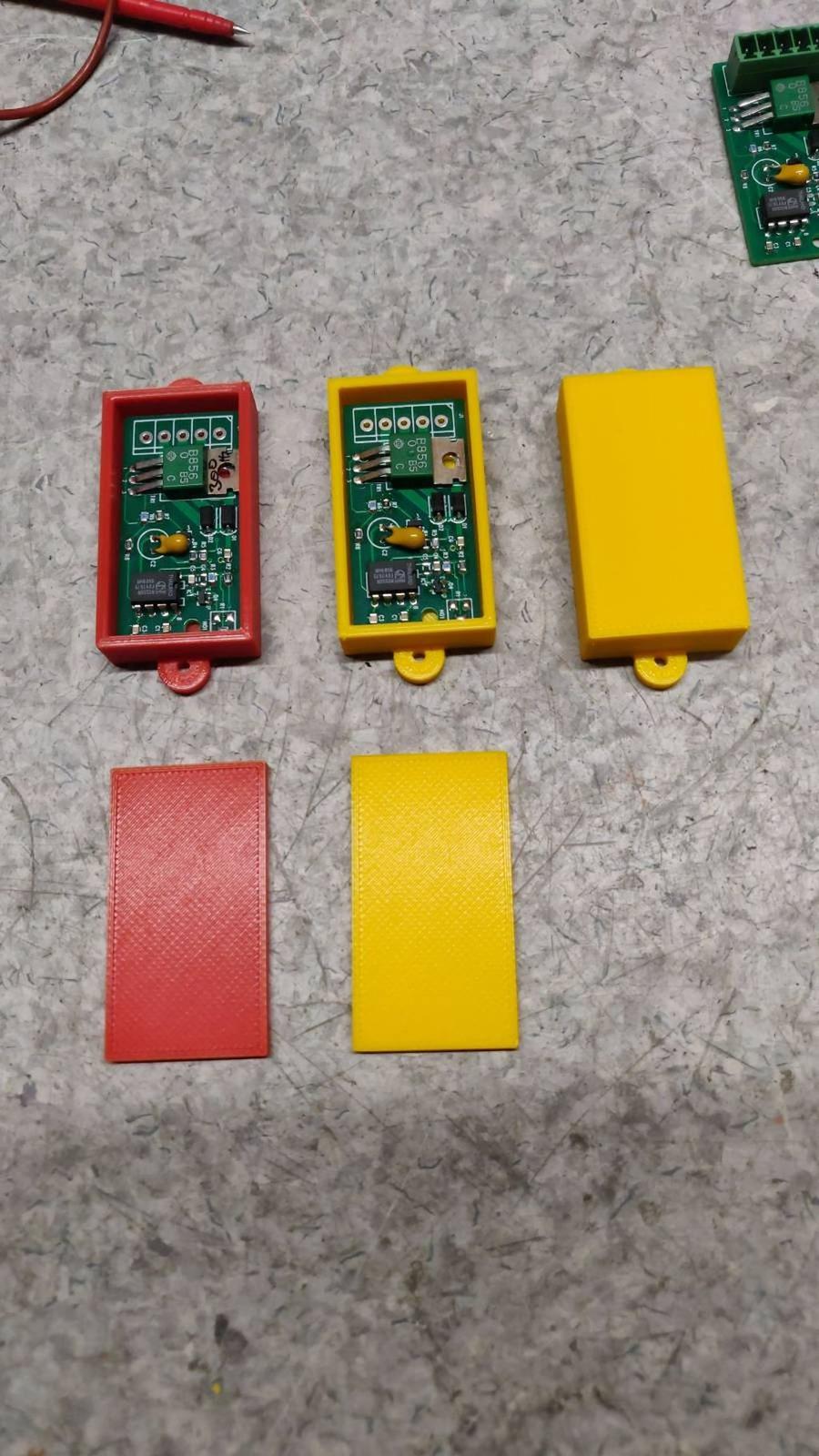 Pari kaljaa ja 3D-osastolle. Yksinkertainen kotelo syntyi helposti. Vielä eri värit eri versioille. Autosovellus kun on niin reilusti muovilakkaa piirilevyjen pintaan. Liimalla purkit kiinni. Olin kokeilumielessä ostanut Bilteman Loctite 3090 kopiota. Pari havaintoa siitä. Sekoitustuubista tullessaan menee hetkessä tahmeaksi mössöksi. Toisaalta ei meinannut kovettua millään vaikka on Express mallia. Piti laittaa purkit pariksi päiväksi puristimeen.