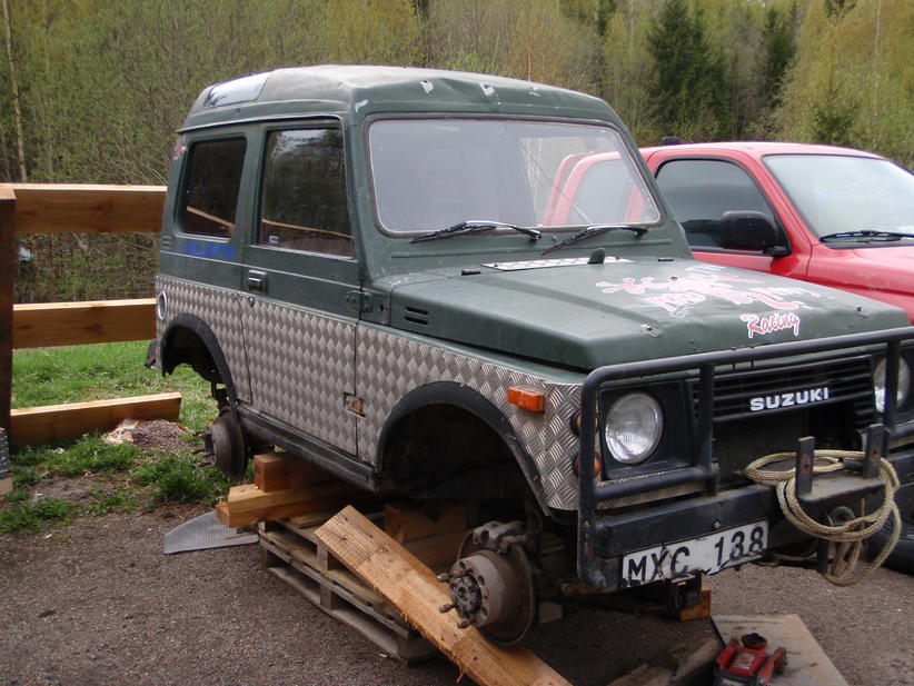 Sutsuki 413 = Merzuki SJ-260Niin se maailma muuttuu, Nissani piti tulla pihaan mutta Sutsuki siihen ilmaantuikin, kiitos Espenille. Ensimmäiseksi auto ilmaan ja renkaat pois ja sitten sisustan purkuun. Autossa 2 johtosarjaa moottorina Swiftin 1.6 ruisku. Yhdistäminen alkoi samointein, ylimääräiset johdot ja muut härpäkkeet vi****n. Kytkin pitää laittaa ja soa tehdä, sen jälkeen pääseekin ekan kerran testaamaan.Kaarien suunnittelukin jo työnalla, kyllä siitä hyvä tulee. Kuveja tulee kunhan saan latailtua kameran akun (muutossa hävis laturi ja viikonlopuksi tulee uusi).