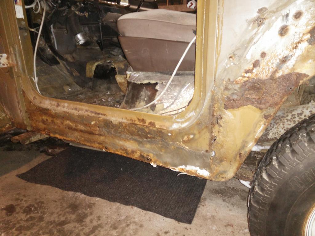 Sitten se savotta vasta alkoi iskemään päälle. Turvakaaren allaolevasta reiästä taskulampulla tuijatessa huomattiin että hieman on koriste peltien alla käyny samat rotat jyrsimässä jotka oli syöny ovien alta palkin pois. Joten ei muutakuin koristeet irti ja tarkistamaan että mitä sieltä löytyy. Korin alaosa oli jossain edellisessä elämässä kierretty kokonaan rosteri helmasarjalla ja pellit oli ruuvattu noin kahdella sadalla ruuvilla kiinni. Ruuvit oli tottakai ruostuneet joten ruuvaamalla ei lähtenyt kuin muutama, loput väännettiin aiai knipexeillä irti. Poraamistakin yritettiin mutta kaikki terät antautui viimeistään toista ruuvia poratessa. Pellit saatiin irti ja sitten se karu totuus pienestä paikantarpeesta paljastui. Molemmilta puolilta kori oli käytännössä ruostunut poikki sisälokareitten kohdalta, Takakulmista ei ollut sen vertaa jäljellä että olisi pellin muotoa saanut ja etuovien alla helmat hävinneet lähestulkoon kokonaan. Ruoste oli syönyt niin pahoin että kori oli tippunut rungon päälle takaosasta ja korin yläosakin oli jo tipahtanut sen verran että jos takimmainen palkki olisi ollut paikoillaan niin takaovet ei varmasti olisi enää toimineet.