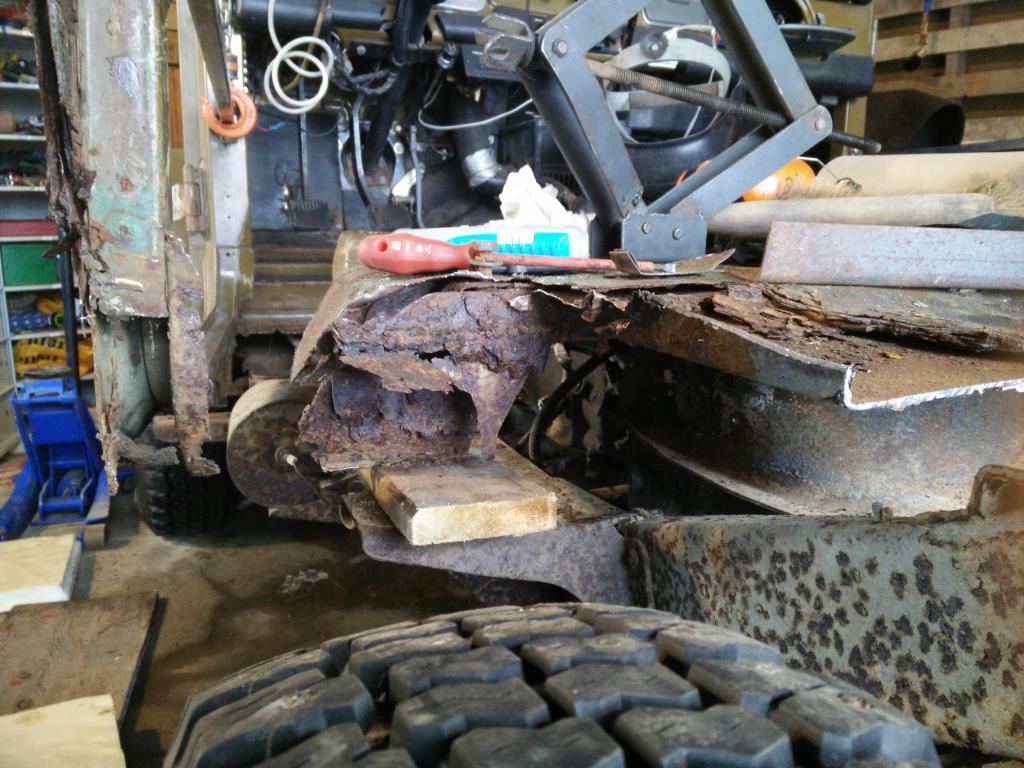 Multitoolia ja puukkosahaa tuli sitten käytettyä kohtuudella. Takakylkiä ei uskaltanut vielä kaikkia leikkoa pois kun ei ole vielä tietoa että minkä kokoiset palaset tulee naapurikylän peltisepältä. Kuskinpuolen lattia leikottiin korinkiinnikkeitä myöten pois kun oli aikaisemmin paikattu vain laittamalla uutta peltiä ruosteen päälle. Samalla lähti sitten melkolailla koko helmakin lattian mukana. Helman tilalle olisi tarkoitus laittaa 120*60 putkipalkki jolloin korin kiinnikkeet saa hitsattua siihen kiinni ja pian aikaa kestää siltä kohtaa hiukkasen nostaakin.Tuon kokoisella palkilla helmalinja nousee 20-40 milliä ylöspäin mutta eipä tätä olla entisöimässä ja plussana saa hieman kestävyyttä ruostetta vastaan.