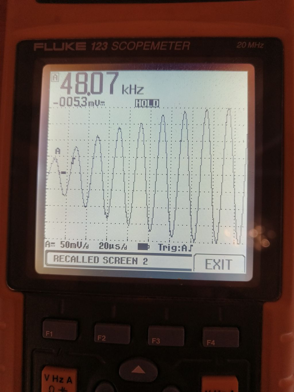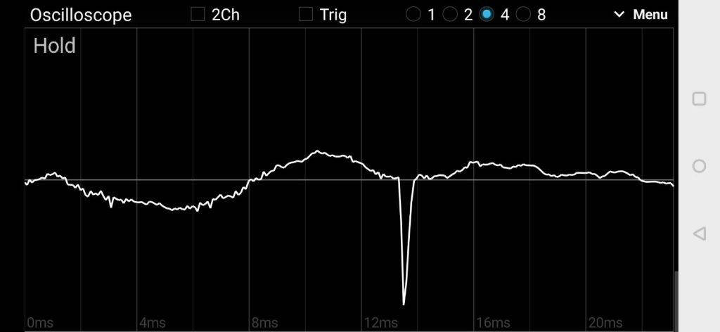 Puhelimeen ladattu Anderoid Car Scanner ei valitettavasti ymmärtänyt mitään Persveivarin parkkitutkajärjestelmästä. Vikakoodit olis ollu siellä jos vaan olisi saanut luettua. Tässävaiheessa oli jo sen verran snajua, että järjestelmä toimii jossain 40-70kHz välimaastossa. Käytännön karkea diagnostiikkakeino on "kuunnella" antureiden signaalia. No milläs kuuntelet. Puhelimeen asennettu Spectroid spektriskooppi ei ylety näin korkealle. Siitä kuitenkin sai havainnon jaksollisesta pohjatason muutoksesta ehjien antureiden edessä. Puhelimeen asennettu skooppisofta antoi paremman vasteen. Sekään ei näytä ultraääni burstia, mutta pulssin avainnus näkyy hyvin. Nettijuttujen mukaan avainnusta voi kuunnella ihan paljaalla korvalla tai stetoskoopilla. No kaikki menetelmät osoittivat, että oikea takakulma olisi pimeä.