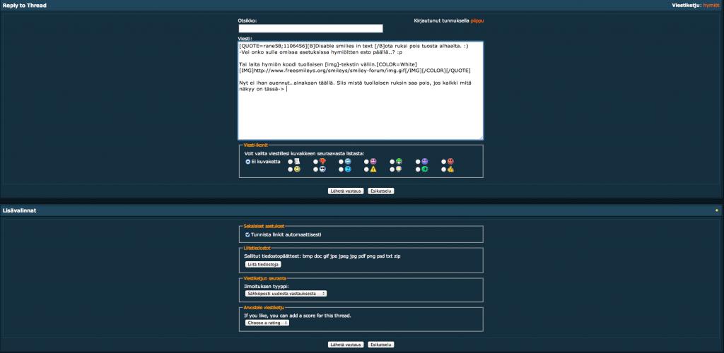 Tai laita hymiön koodi tuollaisen [img]-tekstin väliin.