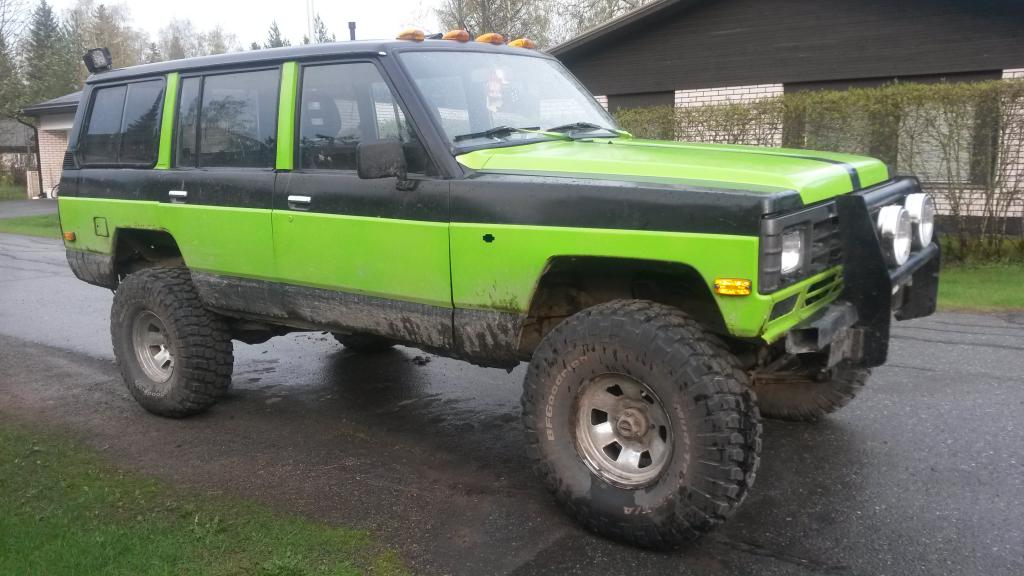 nissan patrol 160 soa 3.3 dsl -88Myyty Leima loppunut huhtikuun alussa. Leimaa varten tarttis laittaa pienemmät renkaat ja pienentää syöttöä ainakin. Jarrut ym alusta pelaa ja valot.Soa korotus tehty ja ajettu silti asvalttiajoa paljon eikä renkaat kulu silmissä. Alla 35" bf goodrich mudterrainit joissa pintaa todella reilusti. takana kiristetty kitka Ei katsastettu soalle. 2 hengen huoltoauto. katolla edessä ns. Rekkavalot ja takana ledtyövalot taakse ja sivuille. karjarauta jossa boschin rosteriset lisäpitkät. Etupuskuri n.5mm palkkia. ei mielellään vaihtoa kuin rahaan ja rahoituskin voi onnistua rahotusyhtiön kautta mun työpaikan toimesta. hintaa 3600 euroa sijaitsee satakunta/kankaanpää palstalaiselle samaan hintaan mukaan hj.n mekaaninen vinssi ja kardaani+cruiserin vinssipeti ja wranglerissa olleet ehjät ranchon 7000 iskarit. Osia ei myydä erikseen Myyty