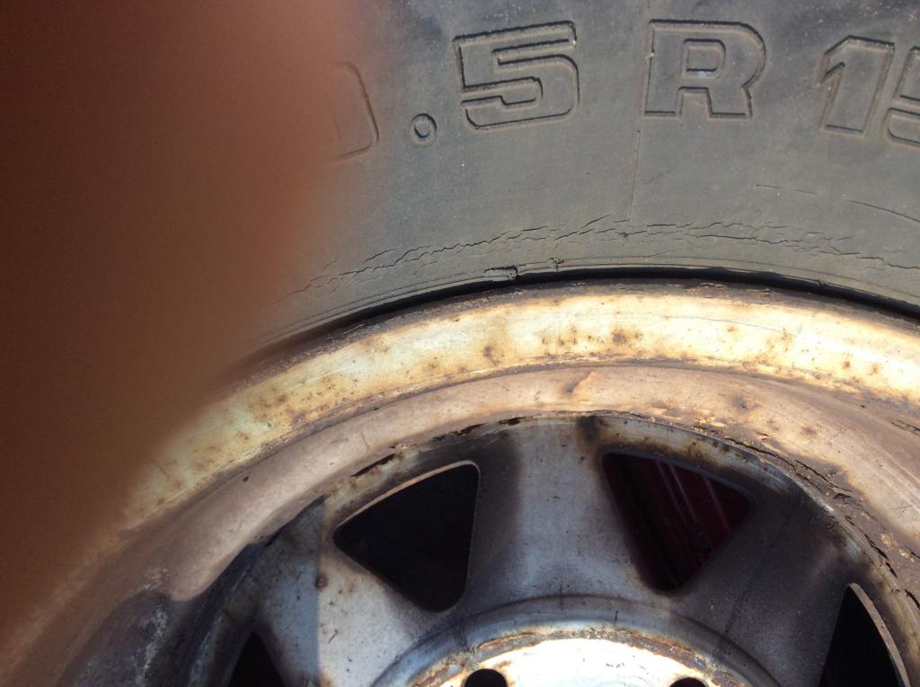 Ei saa kuin yhden kuvan, joku tökkii... Tuossa näkyy ihan selvä reikä, joka saattoi tulla jarruputken katkeamisreissulla. Todennäköisesti ajoin raivaussahalla lyhyeksi katkottuun kantoon ja se meni suoraan läpi. On tuo rengas muutenkin pykinyt ja erilainen kuin muut, joissa ei ole murtumia. Kun kun vaihdoin tilalle vararenkaan, niin loppui myös ihmeellinen woblaus ohjauksesta.