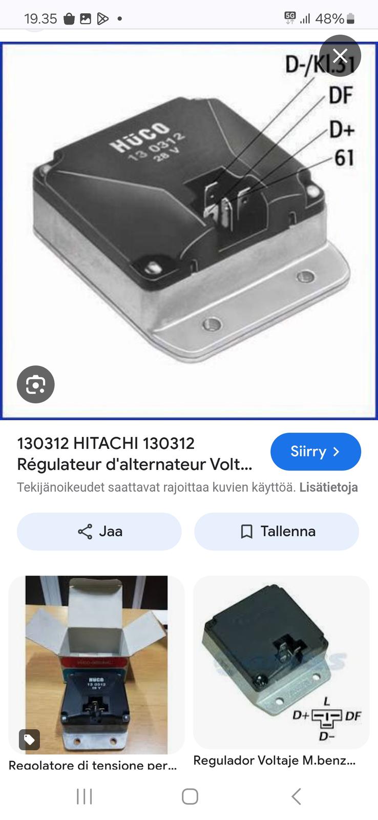 Bj40 jännittensäädin elektrooniseenNyt tartteis jeesiä näinki yksinkertasen asian kans ku vanhan mekaanisen jännitteensäätimen vaihto elektrooniseen. Auto -77 vuotinen ja 3 napasella jännitteensäätimellä Uudessa säätimessä liittimet D+ = akku/b D- = laturin maa /E DF = field/laturin heräte/F 61 = merkkivalolta tuleva/menevä/ IG Systeemi toimii siten että kun kytken: D- liittimen, laturin perää maa(E, valkomusta) Autosta tulevan heräte johdon, liittimeen 61. DF liittimen, laturin perää napaan F (valkovihreä, heräte) D+=tyhjä Lataa tyhjäkäynnillä ja kierroksilla nätisti 28-29v ja orkkis ampeerimittari toimii. Mutta en saa lisättyä merkkivaloa tohon? Yritin laittaa autosta tulevan johdon ja navan 61 välii mut ei syty. Sit jos laittaa jännitteensäätimen d+ napaa johdon laturin d+ navasta, nii jännite tippuu melki voltin pienemmäksi, latauksen valo palaa koko ajan ja auto sammutettuna virta on jokaisessa jännitteensäätimen navassa ja virta lähtee kiertämää takasi autoo, eli puhaltimet ja kaikki toimii vaikka niitten ei pitäs. Eletäänkö ilman merkkivaloa ja todetaa että toimii vai täh? Piirros kuvassa orkkis järjestelmä ja samal tapaa menee nytki johdot. Laturin perässä on yks napa mikä oli tyhjä, johdon väri valko/sininen ja ohut. Kuva uudesta säätimestä L=61