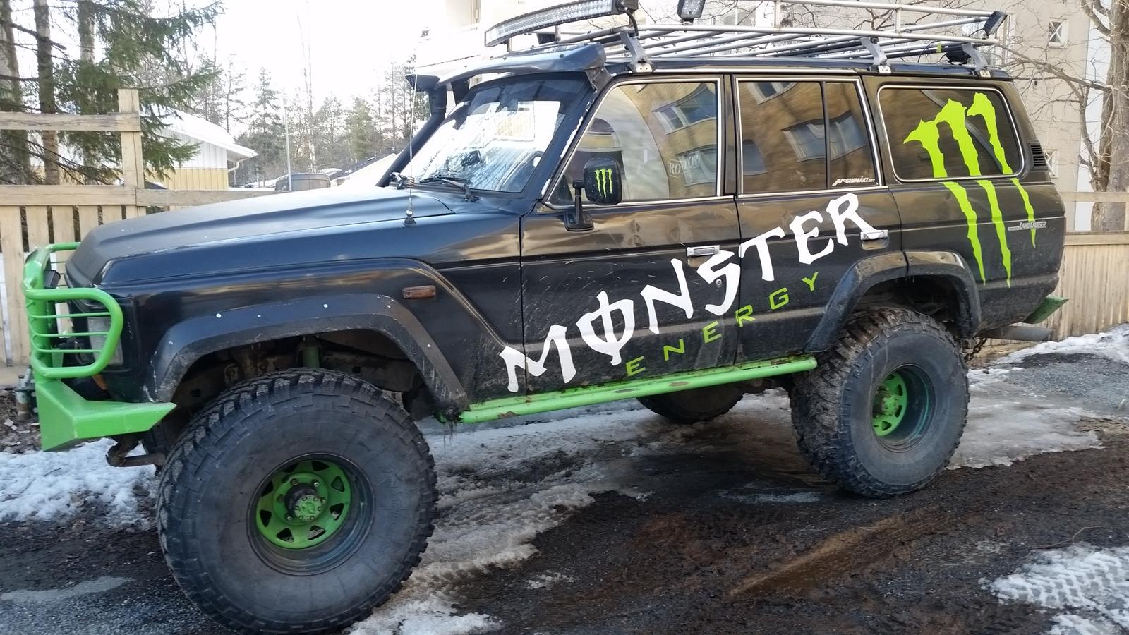 ex MONSTER energy HJ61, eli Kierrätystölkki.Voihan maastoauto ! Kaikkihan alkoi siitä, että erehty kaverin kyytiin sorakuopalle... Pikku Subaruilla tuli leikittyä mukana, 2 " korotuksia ja ISOJA renkaita alle sehän öljypohja pääsi 30 cm ilmatilaan ja talvella alkoi kaverin HJ61:n oleen ihmeissään jäykillä auraavilla akseleilla umpilumessa, kun pikkunen vaan porhalsi.Kivikossa annoin sitten periksi, hiekalla pysty kiusaa, mutta saman tasoisista autoista alkoi syntyä ajatus. Ja mainonnan uhrikin minusta vielä tuli ( kuva 5 ).Ajatuksena oli, joko edistynyt 4-veto käyttö / harraste autona ( lähinnä Toyota tai Land Rover sen hetkisen tarjonnan perusteella ), tai halpa käyttis ja lukkoakseleilla oleva maasturi. Toisaalta vaakakupissa paino myös kaveri automalli, eli olis tietämystä ennestään ja varaosia voisi vaihtaa keskenään jne. Tämä rajasi sitten osaltaan valikoimaa aika paljon ja lopuksi käsistä löytyi Suomea kiertänyt ja omistajia enemmän ollut, kuin laatikossa tölkkejä oleva HJ61. Ja tästähän se ilon kyynel ja sielu verellä yhteiselo alkoi. Että terveisiä vaan Savoon.