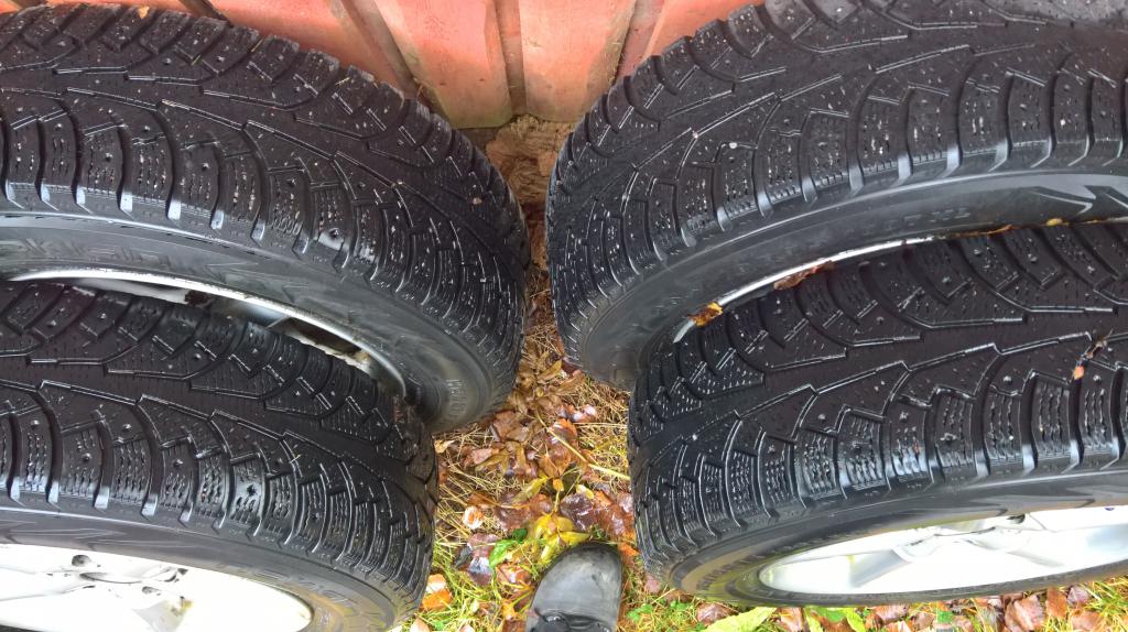 Päällä kuluneet, pintaa 4-5mm (huonoimmassa renkaassa kuvion ohuin kohta 3mm) Hakkapeliitat (205/70 R15 100T XL extra load) joista nastat nypitty. Menee vielä kesäkiekkoina jos haluaa.