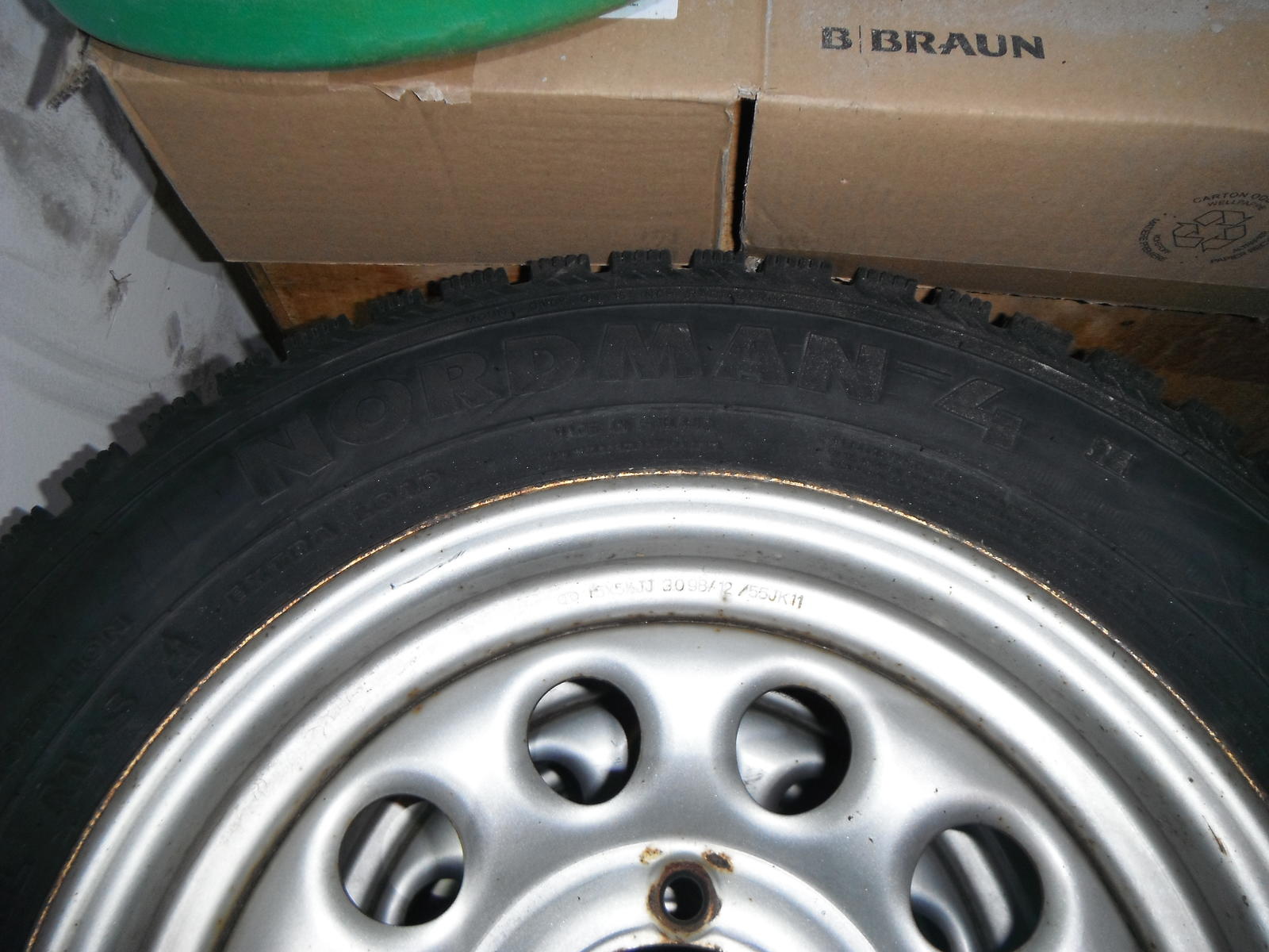 Nordman 4 195/65 R15 made in Finland nastakumit ja Suzukin suht siistit peltivanteet.Aikalailla kaikki nastat tallella ja muutenkin vielä siisti paketti.Pintaa noin 80%