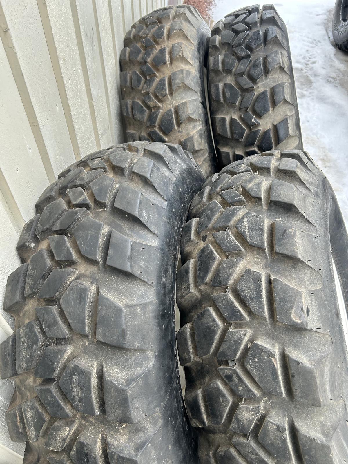 Trelleborg cross country 280/85-16Myyty Toyotan originaali vanteilla Trelleborg cross country 280/85-16 renkaat. Vanteet puhallettu ja maalattu pohjavärillä. Renkaat vanhat, halkeamiakin löytyy mutta mielestäni lähes käyttämättömät. Pintaa keskellä tasaisesti 17mm, reunoilla enemmän.hp.350€Myyty