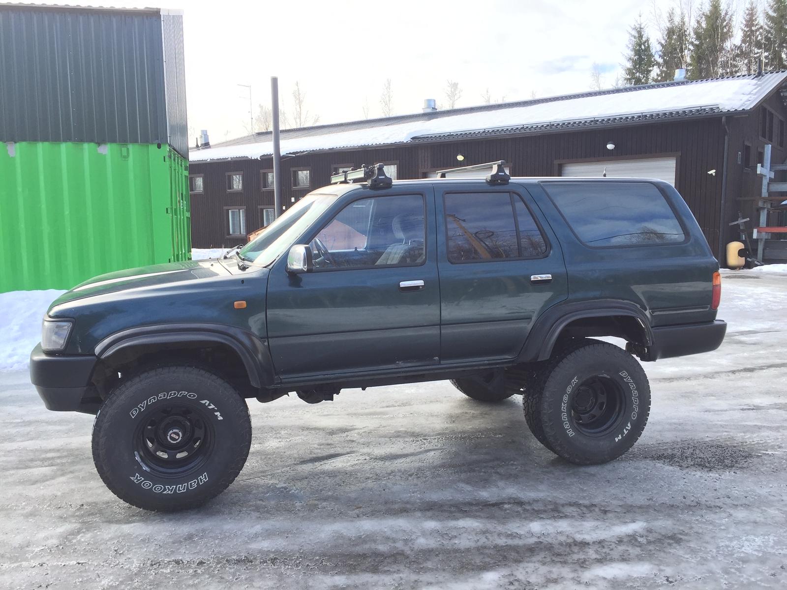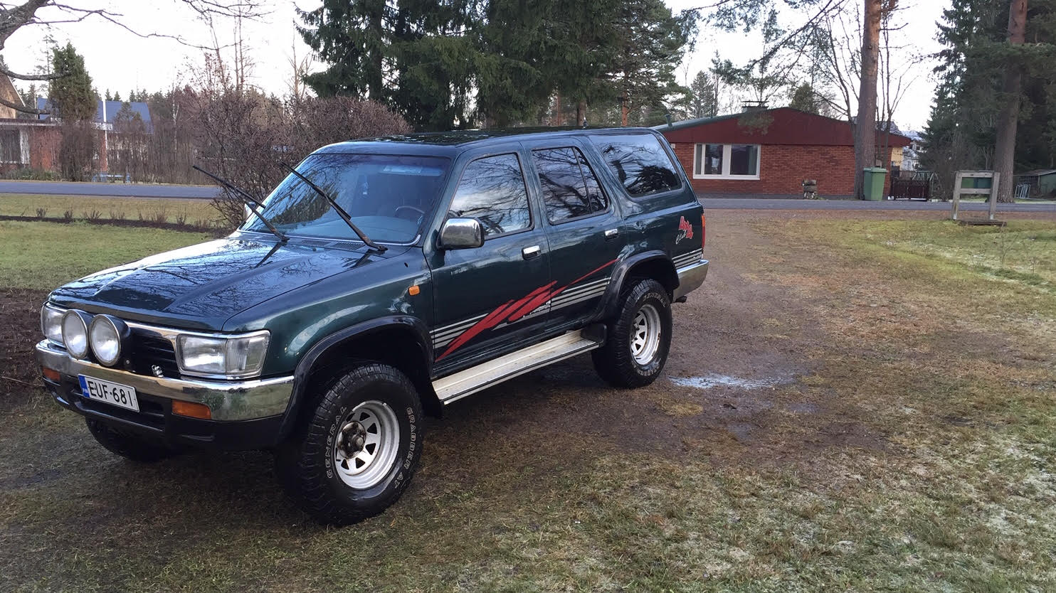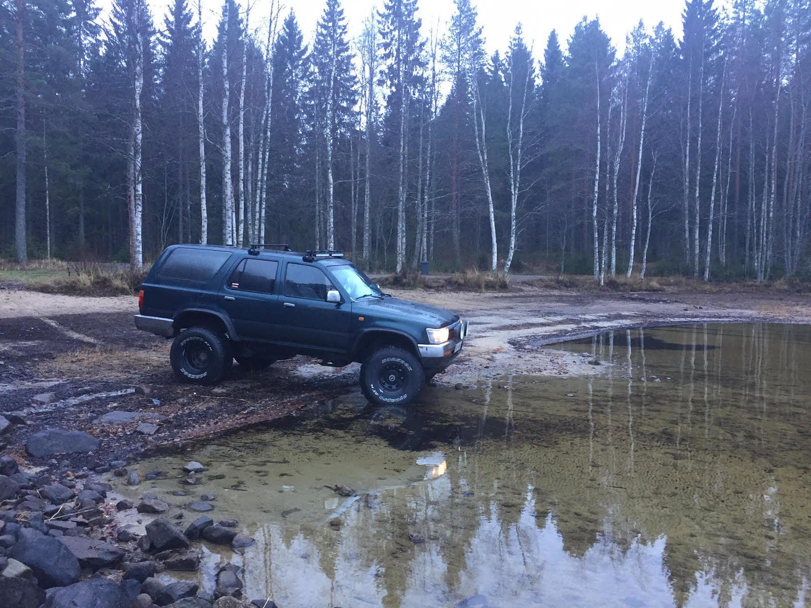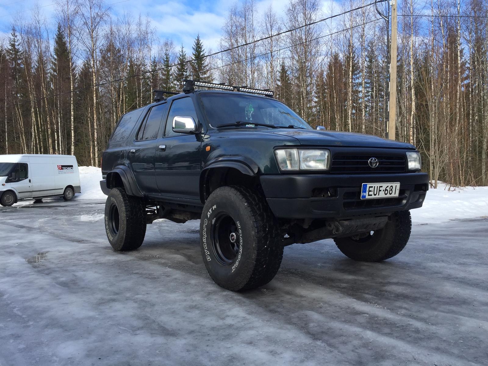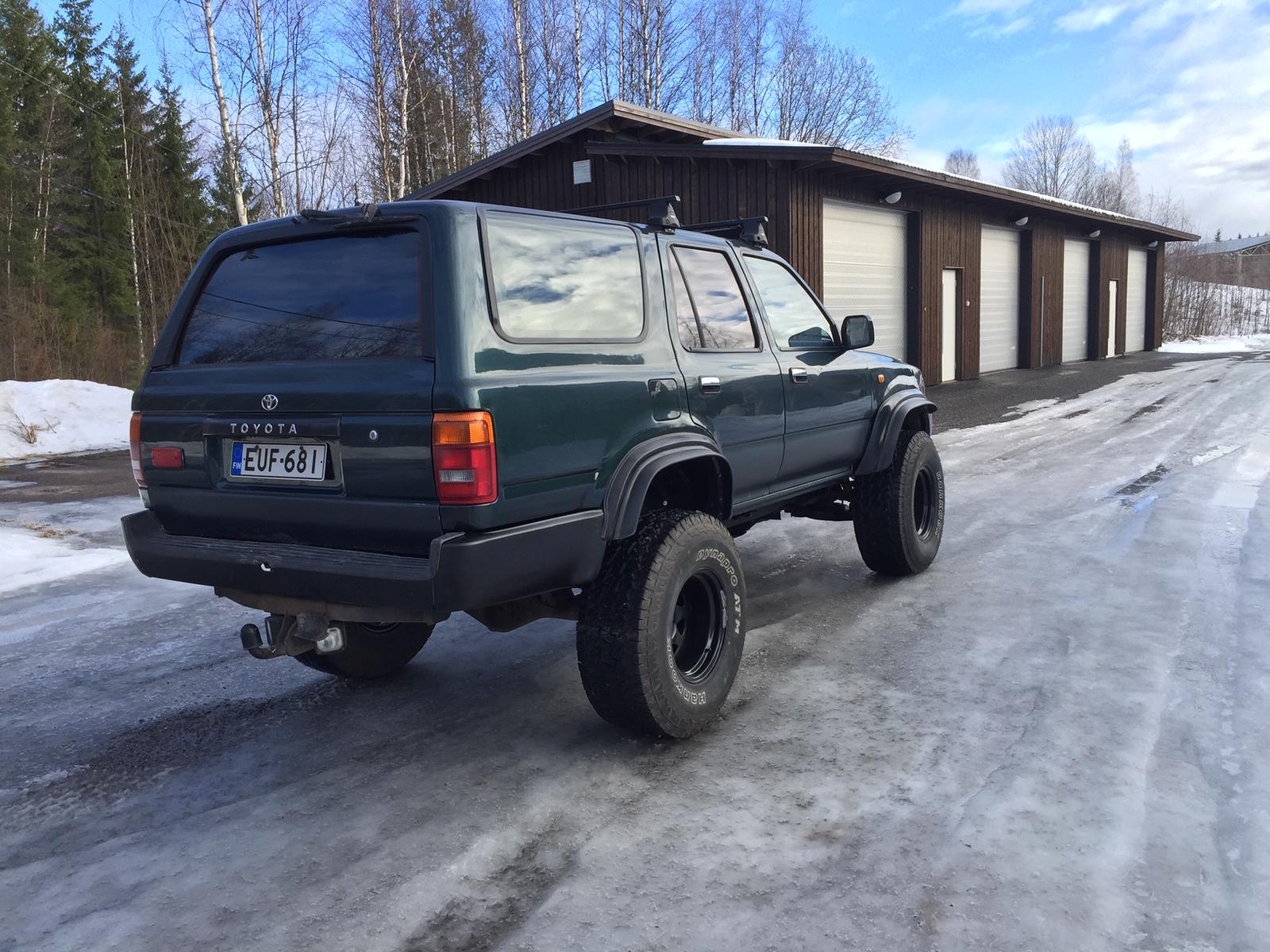 Toyota 4Runner 3.0tdi käyttis ropailuaTerve kaikille! Tässä triidissä ehostetaan ja varustellaan kakkos käyttöauton virkaa hoitavaa vm.94 Toyota 4runneria. Pakuksi rekisteröitynä. Elikä tämä auto on minun ensimmäinen, voi kai sanoa maastokelpoinen autoni. Entuudestaan ei ole juurikaan kokemusta maastureiden ropaamisesta saatika sellaisella ajamisesta. Omistajan vaihdos 11/2017 Kaikki lähti siitä että nykyinen emäntä on hevosen omistaja ja oli kuskannut hummaansa isänsä Rav Toyotalla. No minä olin yhdellä kilpareisulla mukana kuskina ja tuumasin heti, ettei tämä 2 litrainen bensa automaatti nyt kyllä ole oikein häävi kiskoa perässä hevoskärryä. Hevosen tallipaikka on kaiken lisäksi aika syrjässä ja kyseisellä tieosuudella on keväisin oikein hulppeat kelirikot. No minä nettiautoa selaamaan, toyota-ukkoja tässä ollaan niin lantikkaa ensimmäisenä ja hiacea, lantikat oli 2-autoiksi vähän kalliita ja hiacella sai ajella töittenkin puolesta aivan tarpeeksi. No onnksi kaveripiirissä on offiukkoja ja Kitka-met oy:n herrojen kanssa selattiin tarjontaa, sitte löytyi tämä kampe. Saksasta uitettu vm.94 4runner, 3.0tdi motilla ja 224tkm ajettu, huoltokirjalla ja eberillä, vasta leimattu. Kaupat tuli. Auto löytyi joensuun kupeesta, liekkö täälä auton vanhoja omistajia? Kotimatkalla jo mietin että miksei minulla ole ennen ollut jotaki vastaavaa kampetta haha. Auto oli ihan kohtuu siistissä kunnossa pääpiirteittäin. Ostohetkellä Vikoja: takapyörän kaarissa alkavaa kukkaa, edessä ulommat murrokset morjes, takalasi ei toiminut ja kuskin sähkölasi vittuili. Nokka oli saanut pienen pusun jossakin vaiheessa. Varvikello mykkä. Ensimmäisenä ulommat vetonivelet vaihdettiin uusiin ja kiinteitten laippojen tilalle vaihdettiin napalukot. Huilaa kyllä selvästi kevyemmin kun etupäässä mikään ei pyöri. Seuraavaksi ehdin perehtymään takalasiin, ikkuna meni kyllä auki mutta ilman käsiapuja ei tullut ylös, nettiä selaamaan ja takaluukun heikot kohdat selvisi. Tästä oli lasinnostimen moottori morjes ja takalasin kiinnike raudat oli ruostuneet käytännössä kokonaan pois. Marmorilta uudet kiskot, koko takaluukun putsaus, oli muuten paskaa!!! Sitten rasvattiin kaikki paikat ja laitettiin käytetty toimiva moottori, jo alkoi pelaamaan. Myös lasinpyyhin toimii ja kaikki muut härpäkkeet takaluukussa. Tämän jälkeen siivottiin/rasvattiin kaikki muutkin ikkunan hissit, taas pelaa! Sitten tuli öljynvaihdon aika. 10tkm aikana ei ollut tarvinnut lisätä öljyä, orkkis vaihtoväli näytti olevan 15tkm, mutta ei kai nuo vehkeet siitä pahaa tykkää, näin oli toimittu jo useampi kymppi. Samalla tsuumailtiin konetta vähän enemmänkin, nokkahihnassa oli tullut vuodet täyteen, paikalla toyotan orkkis kamppeet, ei ongelmaa. Siltikin laitettiin uusi remmi, seuraaja ja kiristinrulla. 1kz koneessa on ainakin itselleni vastaan tulleista koneista kaiken iisein nokkaremmin vaihto operaatio. 1 tunti ja uudet kamppeet oli hänessä. Samalla vaihdoin uudet apulaite hihnat, näissäkään ei näennäistä vikaa. Laturin hiilisillan uusin myös. Taas ajeltiin. 2018 talven pakkasjakso ennätti pirkanmaan hollywoodiinkin ja akuthan piiputti yhtenä päivänä, ei kuitenkaan niin etteikö liikkeelle oltaisi päästy. No oli kyllä aika jo vaihtaakin, paikalla bilteman 11v vanha ja joku exide 60Ah akut. Tilalle exiden 70Ah hinnat alkaen modelit. Silmällä pitäen sitä että tulevaisuuden vinssit vaatii kuitenkin kunnon akut. Ajelua.. Kesällä Sitten rupesi kyllästyttämään kylkien puna hopeiset teippaukset. 1/3 lähti hyvin irti, loput lähti pintavärin kanssa irti. Samalla selvisi, että kaikki ovet on vaihdettu tähän autoon jostaki alunperin punaisesta autosta. Kevyt hionta ja orkkisväriä paukkupullosta päälle. Omasta mielestäni tuli siistimpi. Taas ajeltiin. Nyt ilmeni ns. ensimmäinen vika, kuskin takapyöränlaakeri antautui, onneksi taaskaan ajo ei loppunut. Huolto kirjassa oli merkintä pyöränlaakereiden vaihdosta 215tkm kohdalla. Vaikutti asennusvirheeltä??? No uusi laakeri yms tupaan ja uudet peräöljyt ja taas mentiin. Sitten laitoin uudet Omen pidemmät iskarit ja takajouset. Perä oli jo vakio jousilla alempana kuin keula. Räpittämistä... Korin korotus 2". Hytän nostin työmaalla rukilla ilmaan, vuoroin keulasta, vuoroin perästä. Syylärin muutokset ja polttoaine täyttöputken jutut oli iisejä., rattiakselin kanssa sai vähän temppuilla, samoiten vaihdekepin röörin, nekin asettui. Kytkimen nesteputki on vielä ns. virityksellä laitettu. Tässä vaiheessa vanhat 31/10.5r15 generalit vaihtui hankookin 33/12.5r15 at pyöriin ja jack wheelerin 10x15 vanteisiin. On kyllä hauskaa kun pyörät on oikesti pyöreät!!! AJELUA... Työreisulla muutamana aamuna ilmeni erikoinen vika, mikään mittariston merkkivalo ei syttynyt aamulla startatessa, laturia yms ihmeteltiin, lopuksi ilmeni relevika, tai no, rele saanut kosteutta, eikä toiminut oikein. Saman reisun lopussa kotio palattuani ihmettelin että etuperän vasemman vetarin stefa varmaan antautunut kun koko murikka aivan öljyssä. Myöskin vetarissa oli mielestäni aika paljon väljää. No löysin 4runnerin ehjän perän ja sitä paikalleen. Totta se oli pienemmästä dieselistä eikä välitys ollut sama. 3,0tdi:ssä 4.1 ja 2lt koneisessa vissiin vakiona 4.56??? No välys tuli tasauspyörästön pikkurattaista. Muuten näytti hyvältä ja välys kunnossa. Lopulta öljyvuodon aiheuttajaksi ilmeni turpon paluuöljynputken antautunut laippatiiviste. Putsaus ja uusi tiiviste häneen. Nyt ei vuoda! Tulihan pestyä koneen alapuoli kunnolla. Elikä nyt on tullut aika lailla tasan vuoden aikana ajeltua 4runnerilla 21tkm. Omat mietteet kakkos autona: pirun mukava kun on kaukosäätöinen toimiva eberi. Lämmin auto! Voima riittää kohtuudella hevoskärryn vetoon, välillä 2 kopukkaa kyytillä. Hyvin henkilöautomainen ajotuntuma ns. maasturiksi. Kulutus maantiellä n.10L, se
