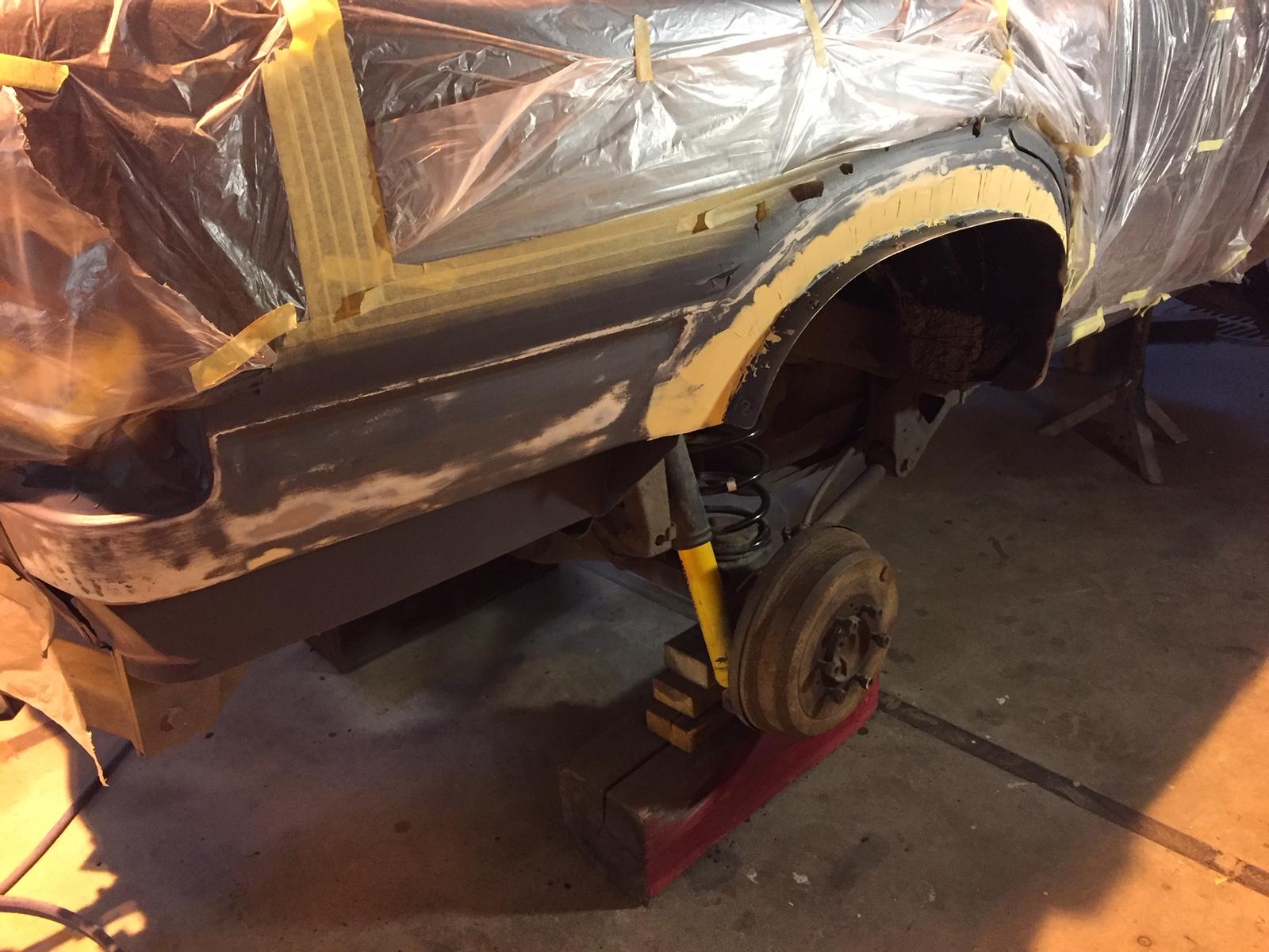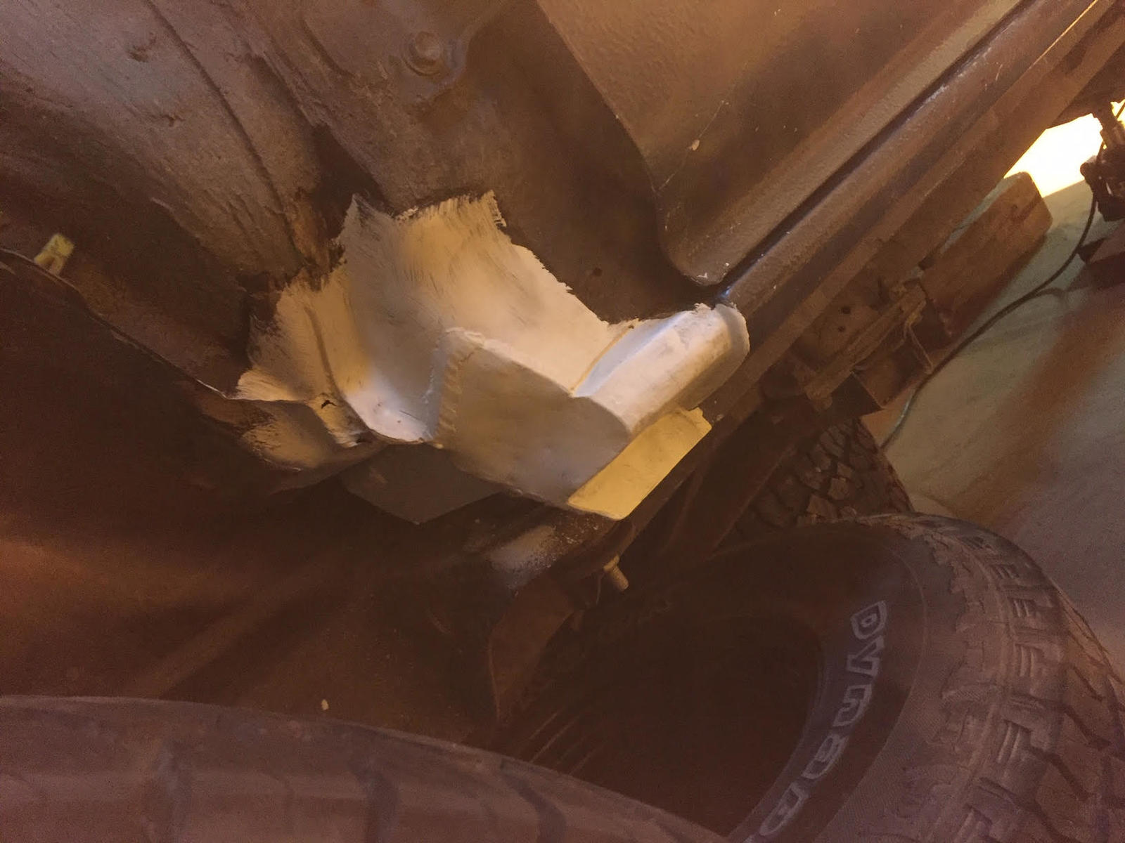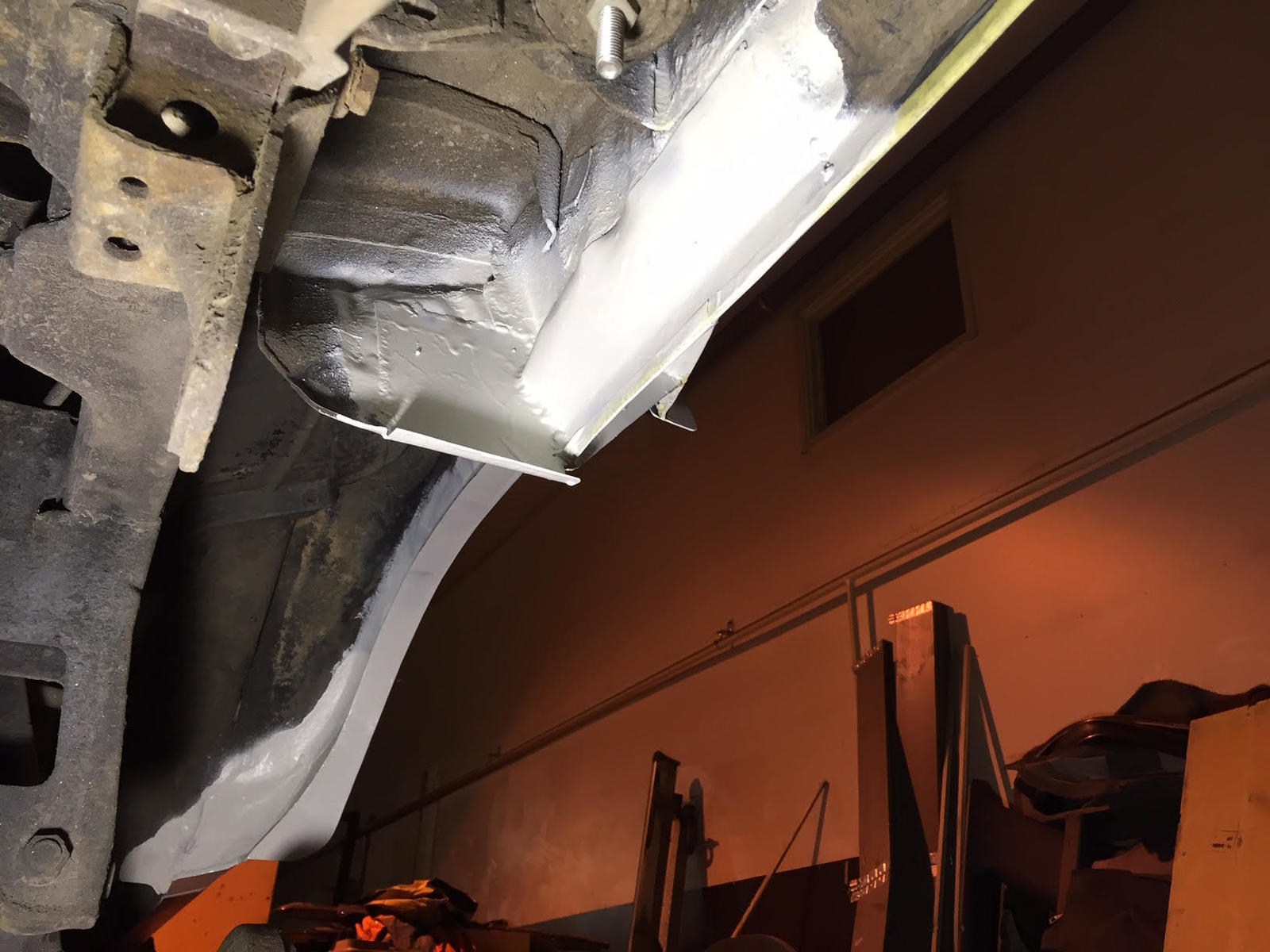 Noniin takakaaret sain hitsattua ja vetästyä ekan kerroksen pohjaväriä. Inerta primer 5 laitoin. Kannattaiskohan tuonne pyöränkoteloon mitä vielä laittaa päälle ennen massaa??