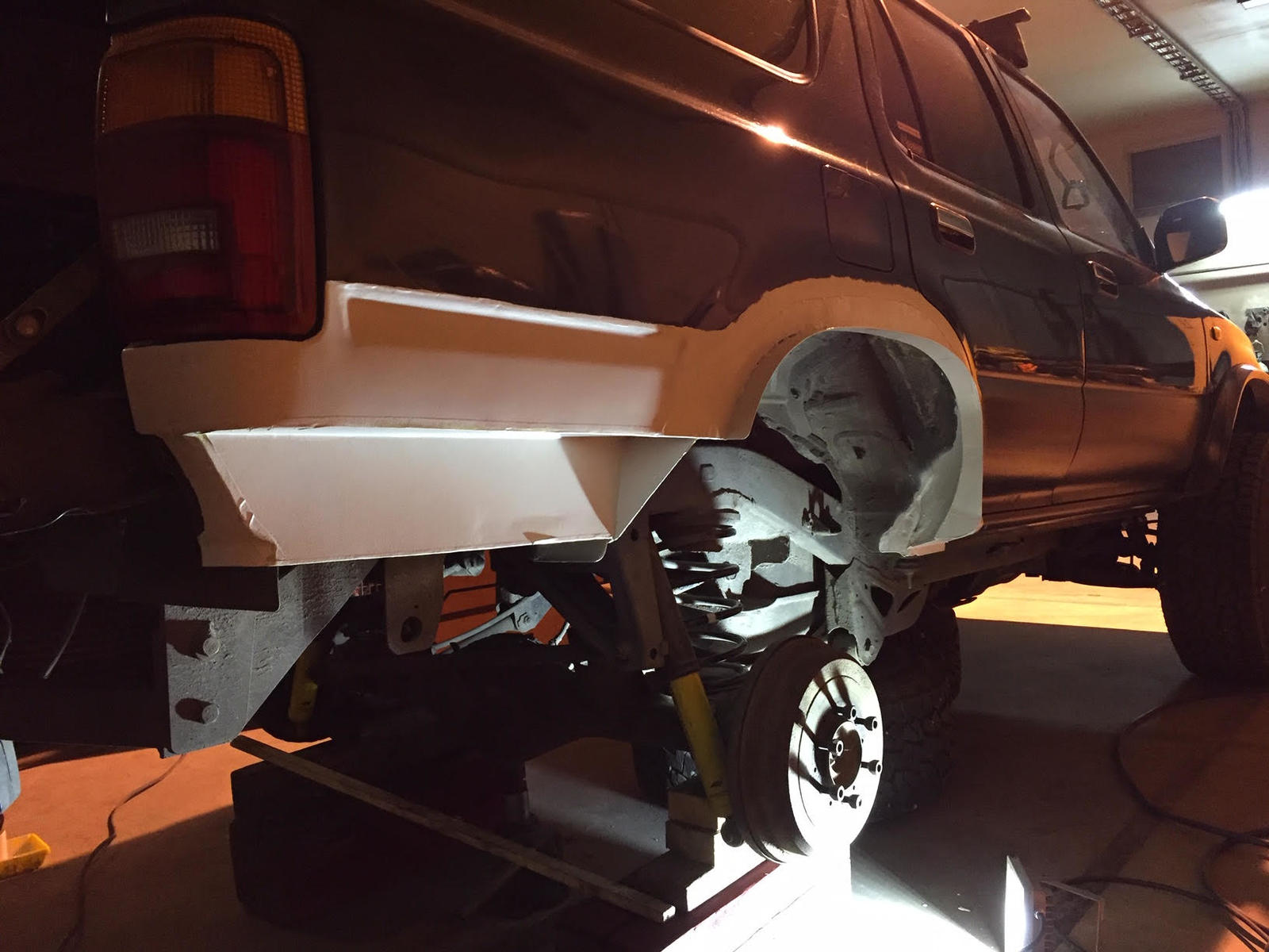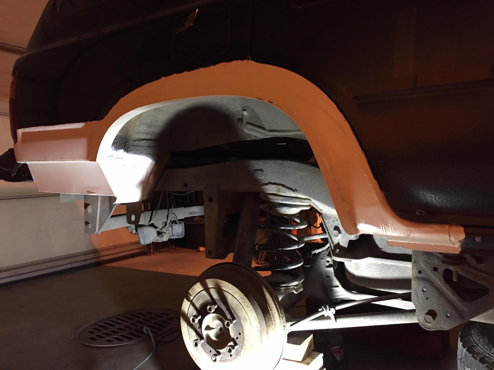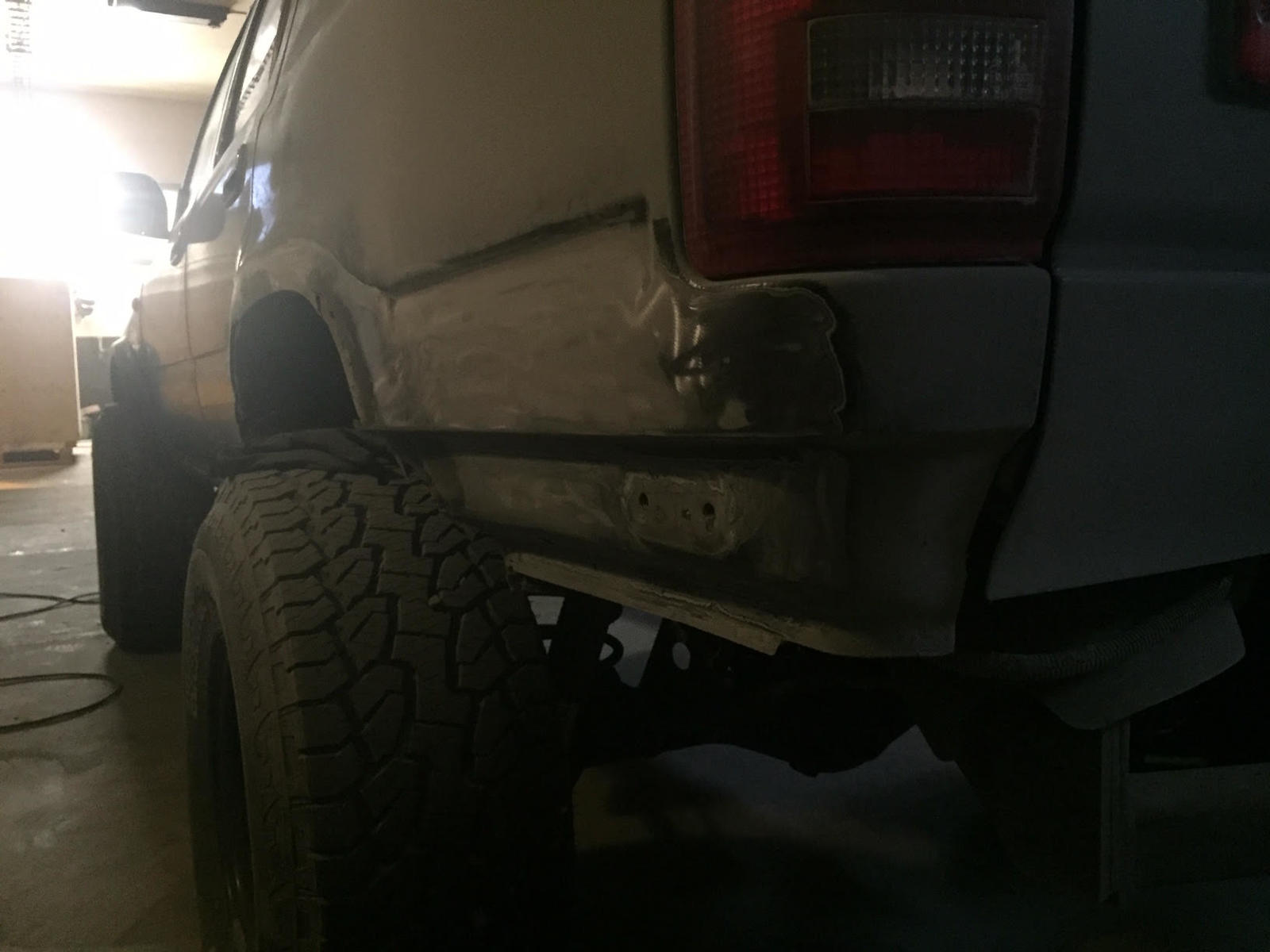 Noniin takakaaret sain hitsattua ja vetästyä ekan kerroksen pohjaväriä. Inerta primer 5 laitoin. Kannattaiskohan tuonne pyöränkoteloon mitä vielä laittaa päälle ennen massaa??
