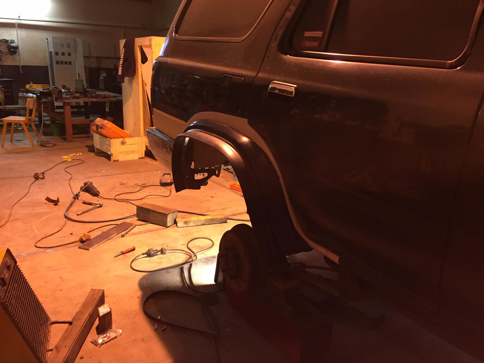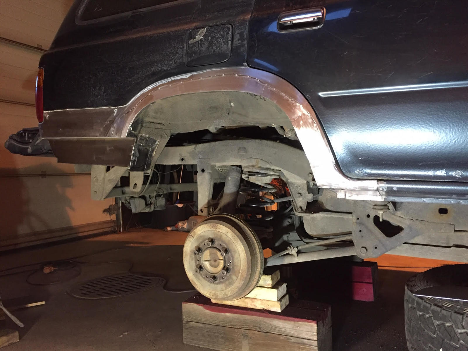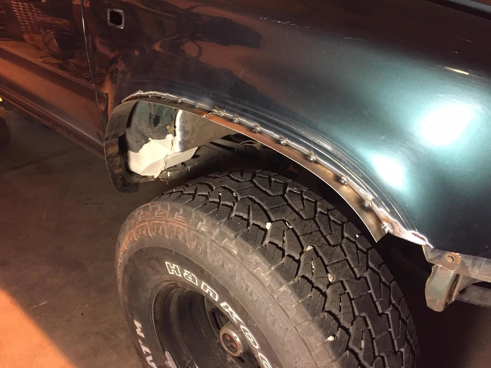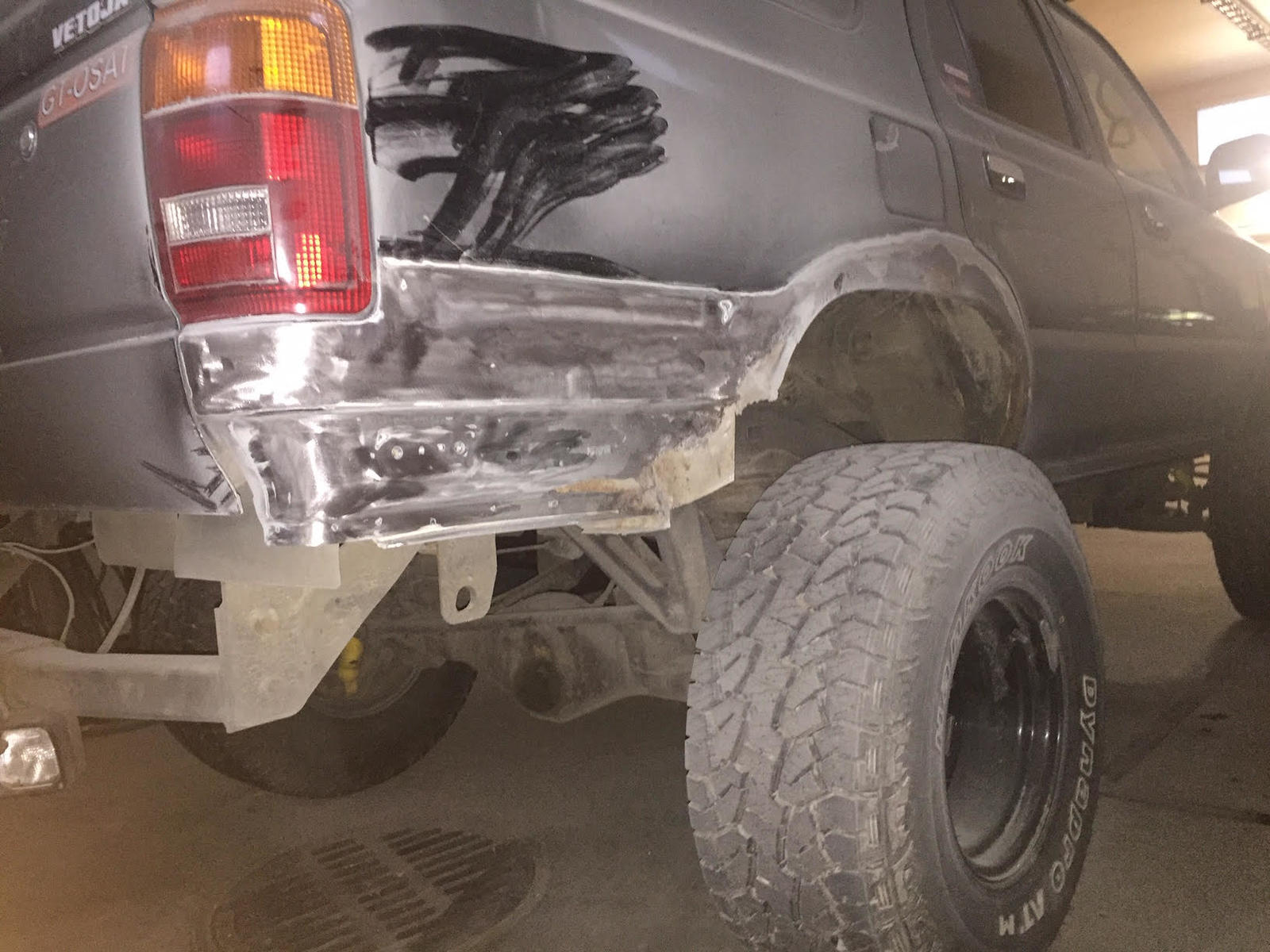 Takapyörien kotelot laikkasin pellille asti ja nyt siellä ja kaikissa muissakin kohteissa mitä on hitsattu on pohjalla 2 kerrosta Inertan 5 primeriä ja justaan sain vedettyä toisen kerroksen Inerta 50 päälle, vielä meinasin yhden kerroksen suhauttaa, massaruiskulla on hyvästi saanut mömmöt pintaan. Etulokareista laikkasin palan takaosasta niin että se on nyt suunnilleen korin kiinnikekorvan tasolla ja koko reunaan hitsasin myös levikepellin jotta muovilevikkeen ja kumilevikkeen saa kunnolla kiinni. Ensiksi kattelin levikkeet kohdilleen ja sitten porasin/kierteytin m6 kierteet peltiin, kaikki on 11kpl m6 ruuveja kiinni. Sitten ruuvsin levikkeet pois ja hitsasin mutterit jo valmiiseen kierrereikään kaveriksi. Nyt pysyy ja saa tarvittaessa pois ja taas kiinni kunnolla!! Takapuskurikin tuli kohdistettua koriin kunnolla, oli kokenut kovia. Meinasin maalata tuon kulahtaneen kromipuskurin mustaksi? Korin ja rungon väliin leikkasin myös peitepalat paskaroiskeiden estoksi, nekin myös m6 läpiruuveilla korissa kiinni. Samasta matskusta teen roiskeläpät. Polyuretaani roiskeläppää. ralliautoissa käyttävät. Myös edestä muoviset sisälokarit sai uuden kohdistuksen ja osittain uudet kiinnitykset. Sitten olis vuorossa etupuskurin oikominen ja tarvittava silppuaminen, siviili ajossa 35" mahtuu sitten pyörimään edessäkin. 33" mahtuu nyt joka asennossa pyörimään ainakin mitä rukilla sai nurkkia nosteltua. Edestä meinasin maalata maskin osat myöskin mustiksi ja uudemman modelin parkki/vilkku umpiot tulee myöskin kaveriksi. Sitten takakylkien kittaus ja sen päälle maalaus myös eteen. Jotakin kuvatuksiakin on, valo tuola hitsuuhallissa vaan on aivan paska. |