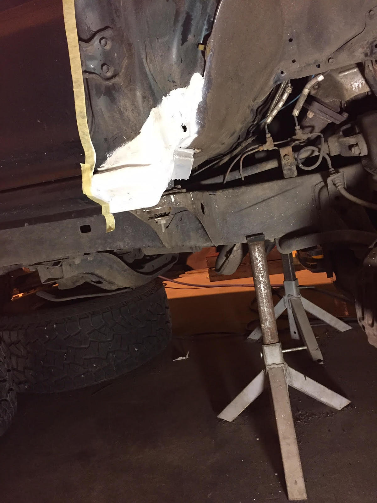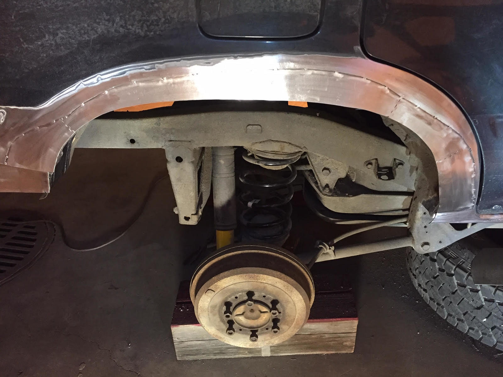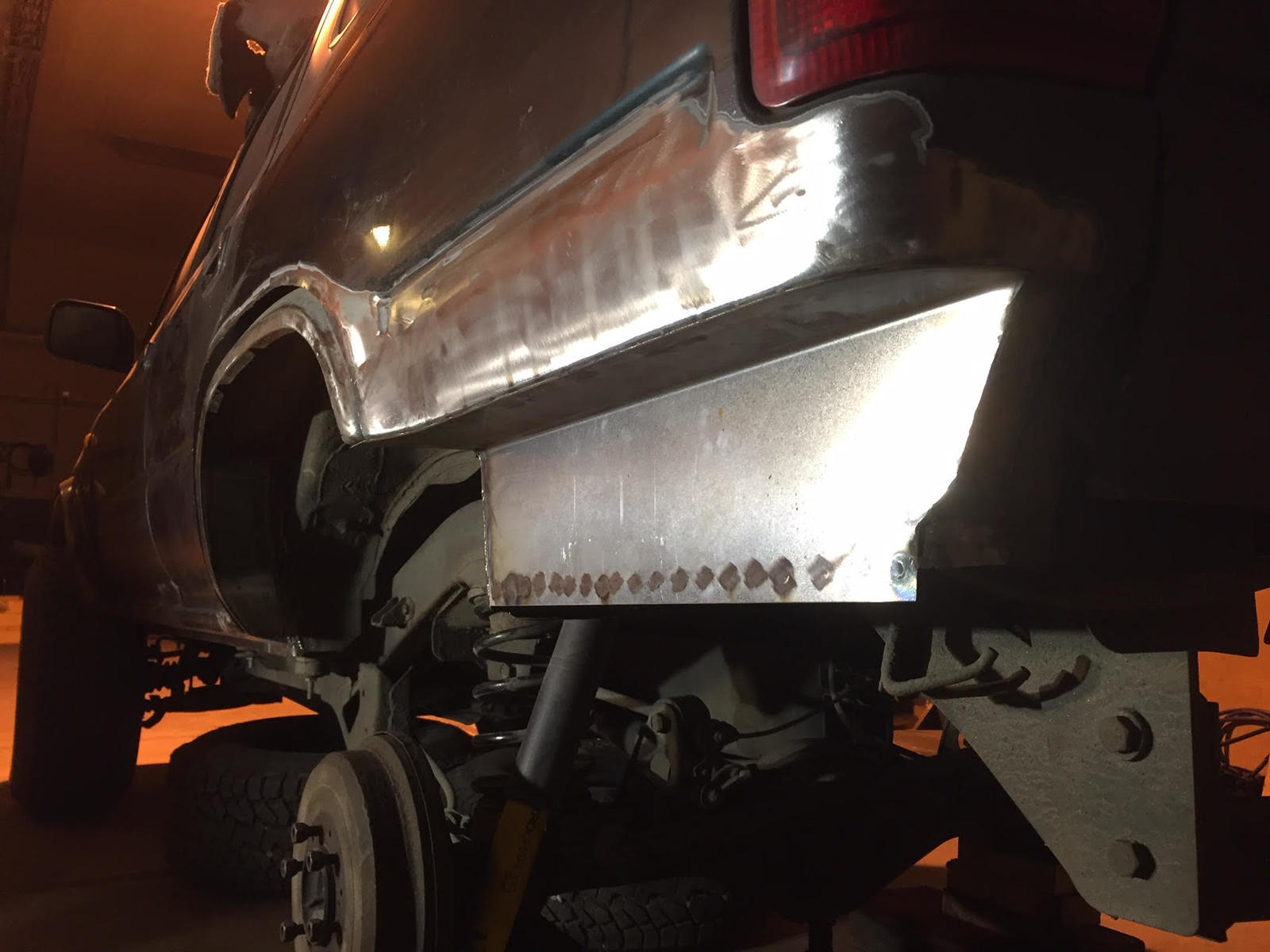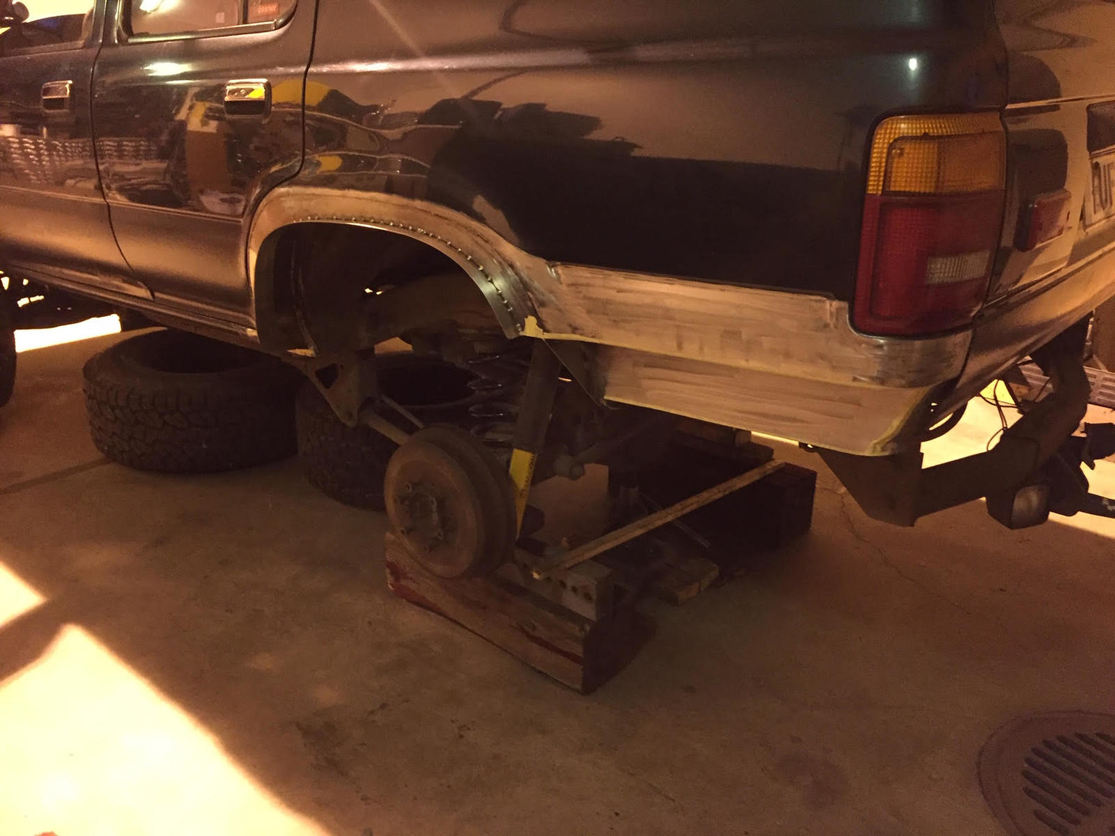 Takapyörien kotelot laikkasin pellille asti ja nyt siellä ja kaikissa muissakin kohteissa mitä on hitsattu on pohjalla 2 kerrosta Inertan 5 primeriä ja justaan sain vedettyä toisen kerroksen Inerta 50 päälle, vielä meinasin yhden kerroksen suhauttaa, massaruiskulla on hyvästi saanut mömmöt pintaan. Etulokareista laikkasin palan takaosasta niin että se on nyt suunnilleen korin kiinnikekorvan tasolla ja koko reunaan hitsasin myös levikepellin jotta muovilevikkeen ja kumilevikkeen saa kunnolla kiinni. Ensiksi kattelin levikkeet kohdilleen ja sitten porasin/kierteytin m6 kierteet peltiin, kaikki on 11kpl m6 ruuveja kiinni. Sitten ruuvsin levikkeet pois ja hitsasin mutterit jo valmiiseen kierrereikään kaveriksi. Nyt pysyy ja saa tarvittaessa pois ja taas kiinni kunnolla!! Takapuskurikin tuli kohdistettua koriin kunnolla, oli kokenut kovia. Meinasin maalata tuon kulahtaneen kromipuskurin mustaksi? Korin ja rungon väliin leikkasin myös peitepalat paskaroiskeiden estoksi, nekin myös m6 läpiruuveilla korissa kiinni. Samasta matskusta teen roiskeläpät. Polyuretaani roiskeläppää. ralliautoissa käyttävät. Myös edestä muoviset sisälokarit sai uuden kohdistuksen ja osittain uudet kiinnitykset. Sitten olis vuorossa etupuskurin oikominen ja tarvittava silppuaminen, siviili ajossa 35" mahtuu sitten pyörimään edessäkin. 33" mahtuu nyt joka asennossa pyörimään ainakin mitä rukilla sai nurkkia nosteltua. Edestä meinasin maalata maskin osat myöskin mustiksi ja uudemman modelin parkki/vilkku umpiot tulee myöskin kaveriksi. Sitten takakylkien kittaus ja sen päälle maalaus myös eteen. Jotakin kuvatuksiakin on, valo tuola hitsuuhallissa vaan on aivan paska. |