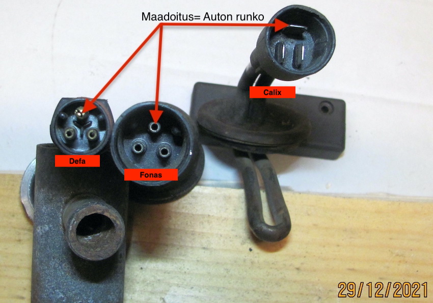 Vanhojen lohkolämmittimien sähköinen turvallisuusTarkistin menneen viikon aikana useita vanhoja lohkolämmittimiä ja tulin siihen tulokseen että ne on aina tarkistettava ennen käyttöönottoa! Näistä kolmesta puuttui yhteys maadoitus-liitoksesta runkoon! Tappava puute, varsinkin kun Defa ja Calix;n vastus näytti 35ohm maahan Helpoin on ottaa kytkeä akun+ napaan testilamppu ja testilampun toinen pää pistotulpan maadoitusliuskaan, jos lamppu palaa on ainakin alkupään maadoitus kunnossa Jos haluaa tarkistaa lisää joutuu irroittamaan johto lohkolämmittimestä Muista irroittaa akkulaturi ja sisätilan lämppäri ennen testausta!