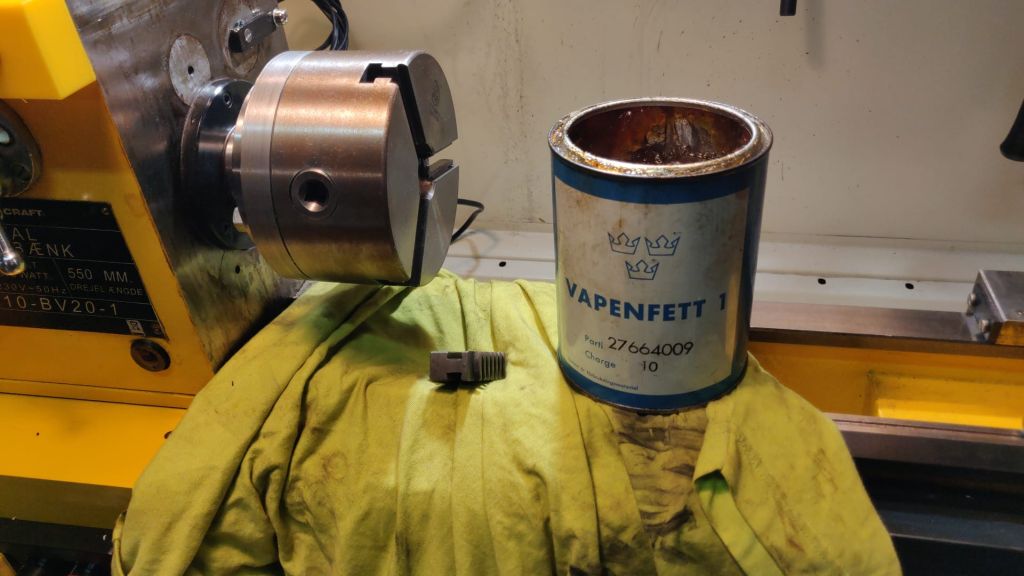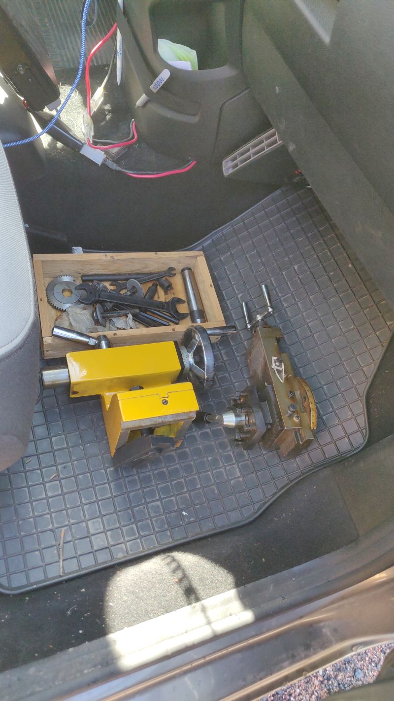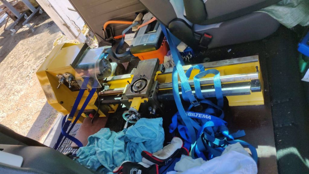 Ensimmäisiä huomioita kun kone oli saatu ulos Persveivarin kontista. Pakka oli väännetty väkisin "lintaan" kiinni. Karalaipan olkapää ottanut vähän hittiä. Raakasti viilalla pikahuoltoa ja ensimmäinen lastu kokeeksi. Kaikki tuntui toimivan, mutta vaihdeloota piti julmaa rallatusta.