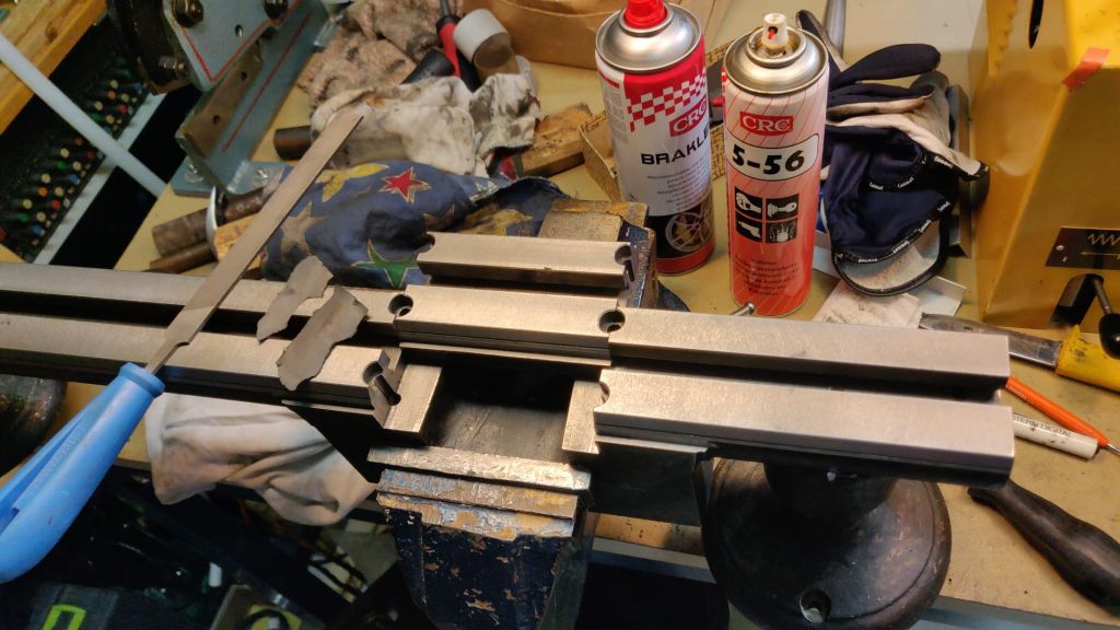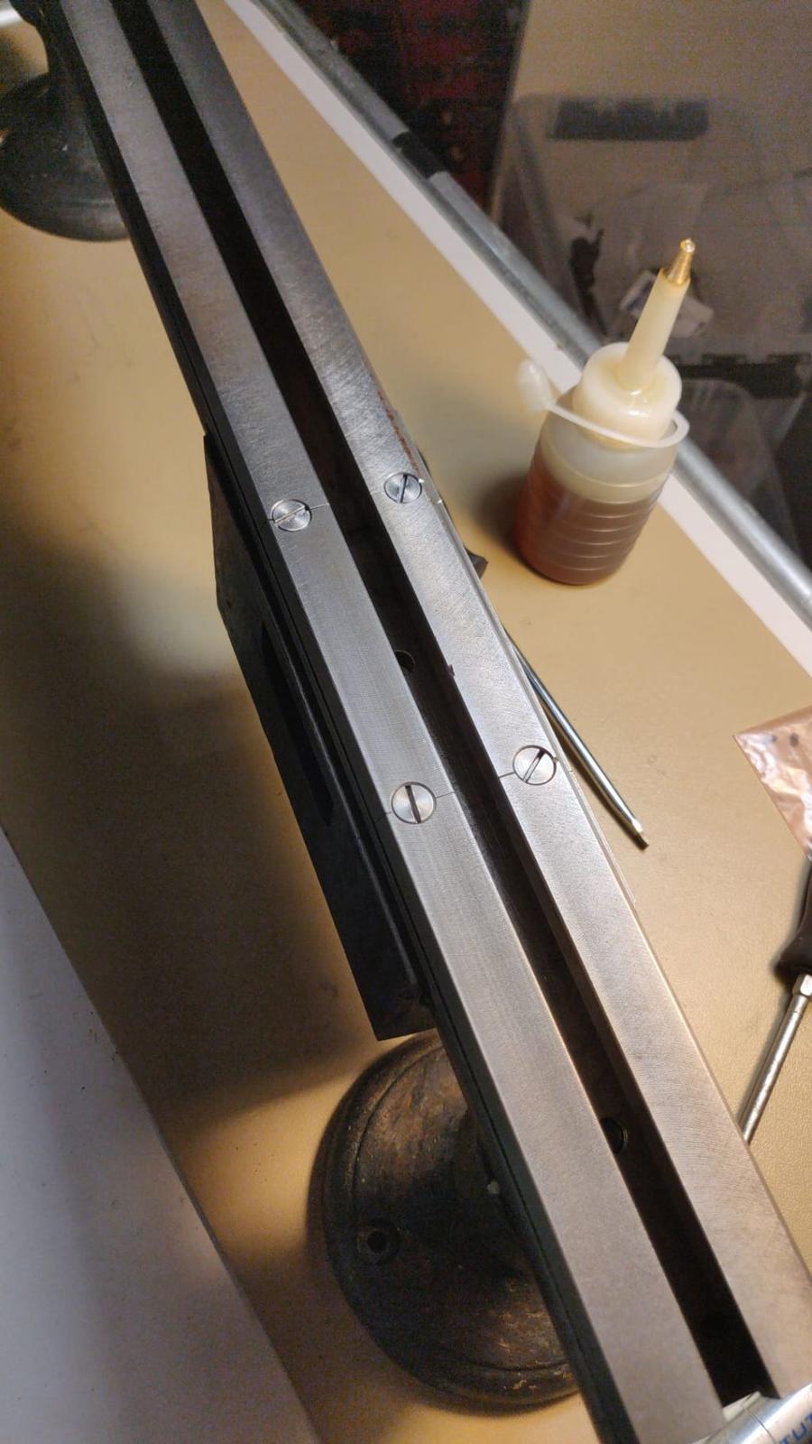 Tässä pieni moka oli, että koneistuksessa jäi tuo kitapala vaille huomiota. Kun sen myöhemmin irroitti niin paljastui maalia ja muuta moskaa alta. Kun ne putsasi oli kitapala shimmattava johteiden kanssa samaan tasoon.