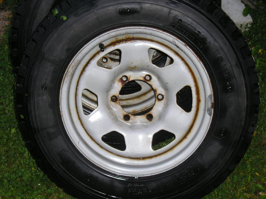 HJ61:n alkuperäiset vahvat teräsvanteet joissa päällä vanhat talvirenkaat. H. 100€