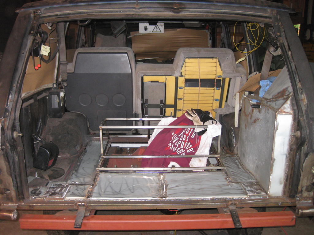 Jos tarkoitat keskivyön ja lukkokappaleiden kiinnityksiä, niin takalattialla lenkit joihin pikalukoilla vyöt tulee kiinni. Lenkit pultattu lattian läpi palikoihin, jotka pultattu runkoon.