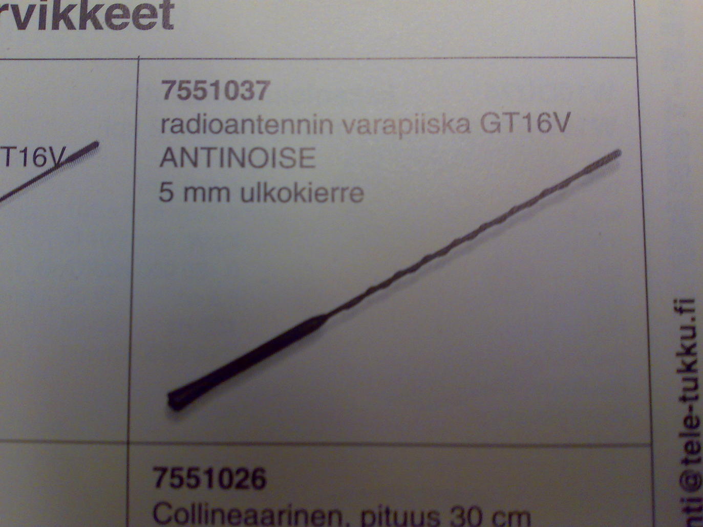VW/Audi antenniOstettu Ostetaan vuoden 2004 golffiin antenni. Eli se malli missä johto kulkee kierteisesti suojamuovin alla. Kaikissa 90-luvun ja 2000-luvun alun volkkareissa ja audeissa lienee samanlainen? Ainakin passatissa ja A4:sessa.Ostettu