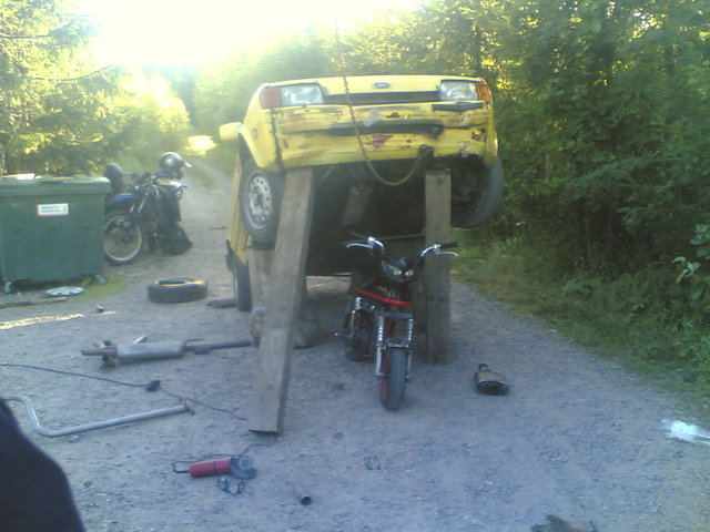 Pukki talkoot melkein puolessa välissä. Taakse tulee 165cm korkee ja eteen vähän matalampi. Näitä pukkeja tullaan käyttämään tulevaisuudessa esim. kytkimen vaihtoon. Vaihteiston käpälöinti vaatii ainakin etu akselin irrotuksen