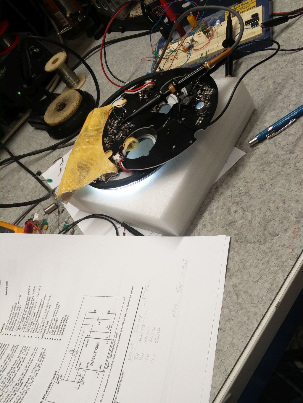 Lampuissa on omat sisäiset powerit LED-ketjujen hallintaa varten. Juusolla sattui olemaan yksi Nelisilmän raato mistä pääsi tekemään vähän reverse engineering hommia ja mittauksia. Kohtuullisella tutkiskelulla selvisi, että näissä lampuissa kontrolleri on kiinan ihme IS31LT3360 continuous mode inductive