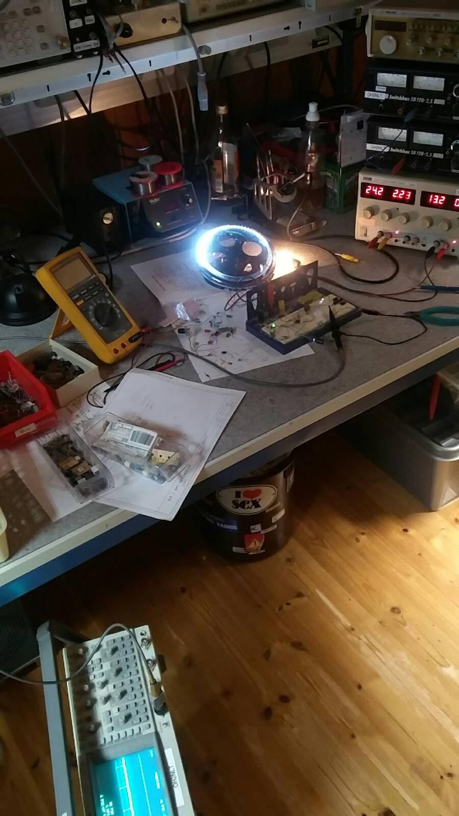 Kun speksit oli kasassa niin lopullinen kytkennän suunnittelu ja siitä sitten pieni piirikortti. Kun piirikortit olivat käsissä niin mallikappaleiden kasaus ja viimeinen hienosäätö kytkennälle. Hienosäätövaiheessa nelisilmä lampulle valikoitui pwm taajuudeksi noin 130Hz. Tämä siksi, että lampun konvertterin input konkka piti muilla taajuuksilla ikävää sirinää. Tämä piezzosähköinen värähtely voi ääritapauksessa ollessaan voimakas ravistaa komponentin irti juotoksesta. Cyklooppi lampun poweri taas osoittautui pienillä alle 100Hz pwm taajuuksilla epävakaaksi. Tuotteesta tuli näin ikävästi kaksi versiota. Cyklooppi 300Hz ohjauksella.