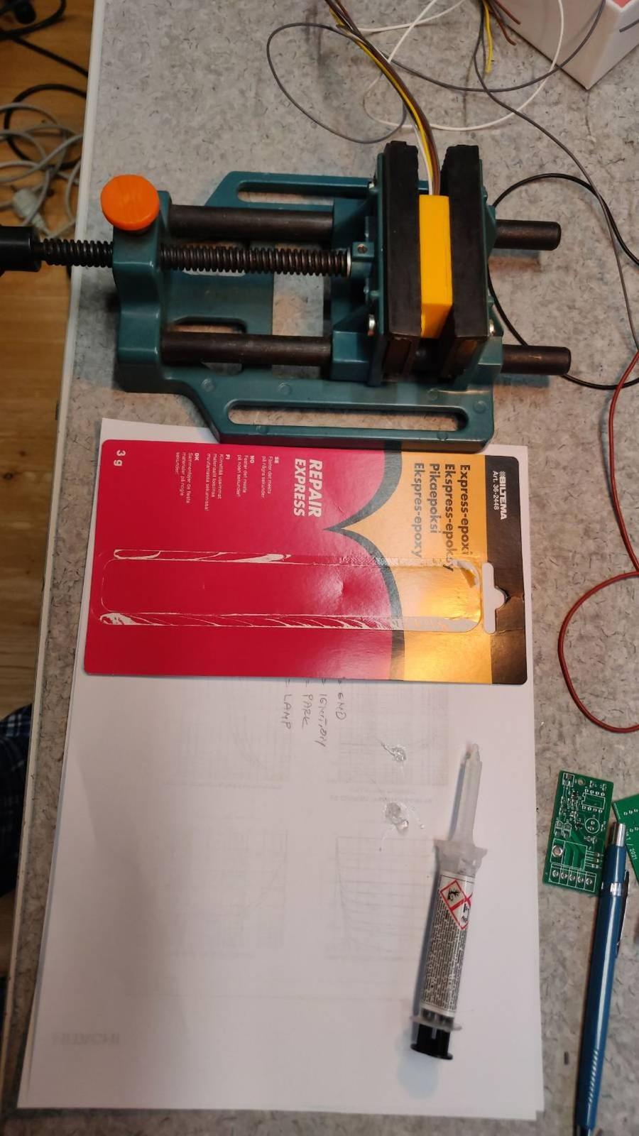 Pari kaljaa ja 3D-osastolle. Yksinkertainen kotelo syntyi helposti. Vielä eri värit eri versioille. Autosovellus kun on niin reilusti muovilakkaa piirilevyjen pintaan. Liimalla purkit kiinni. Olin kokeilumielessä ostanut Bilteman Loctite 3090 kopiota. Pari havaintoa siitä. Sekoitustuubista tullessaan menee hetkessä tahmeaksi mössöksi. Toisaalta ei meinannut kovettua millään vaikka on Express mallia. Piti laittaa purkit pariksi päiväksi puristimeen.