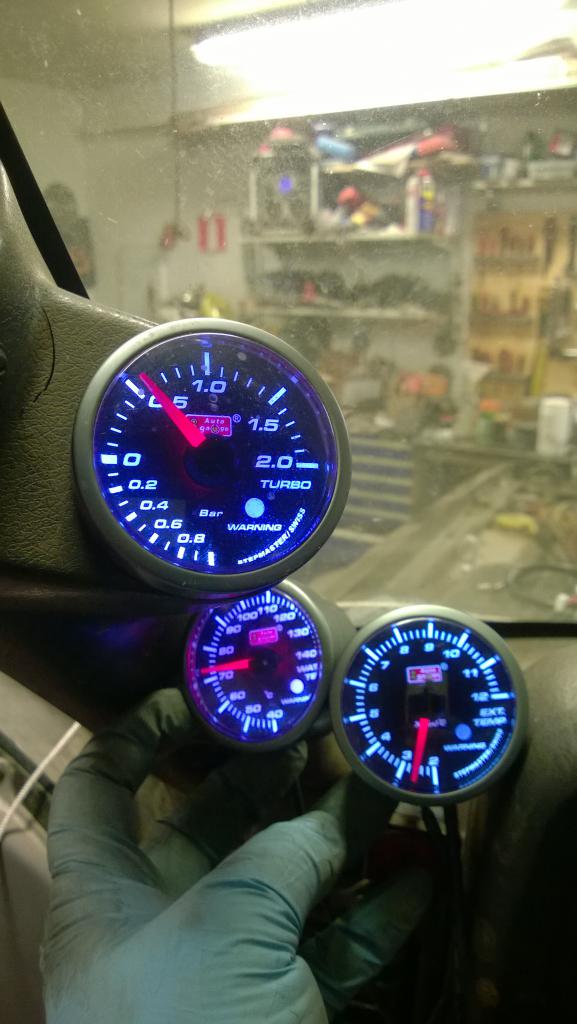 En sitten malttanut odottaa sähköjen oikeaa kytkemistä vaan pitihän se pikasesti testata että mittari ja anturi toimii. Auto käyntiin ja vapaalla
