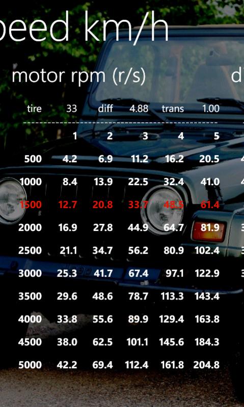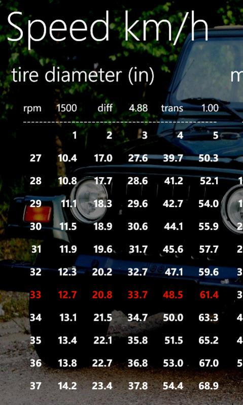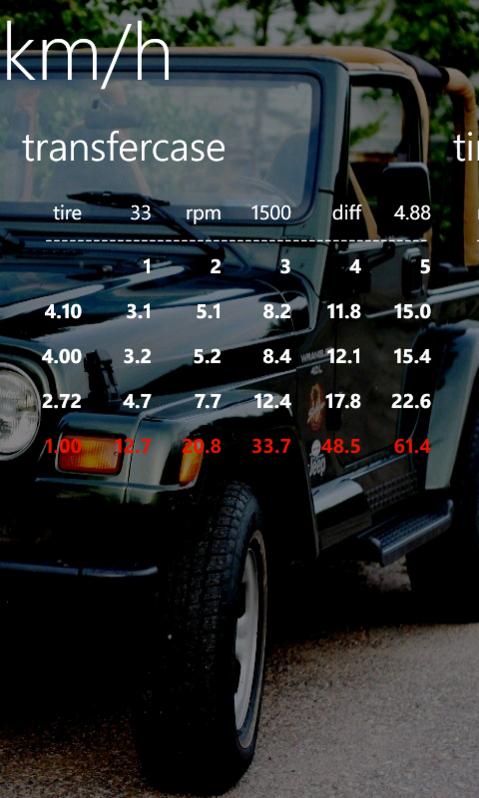 Välitys/nopeuslaskuriTein harjoituksena Windows puhelimeen välityslaskurin. Esimerkkikuvista näkee nopeudet eri vaihteilla entä/jos tyyppisesti. Vaihtaa voi renkaan halkaisijaa, moottorin kierroslukua, perävälitystä ja jakolaatikon välitystä. (Voi olla että tämä tulee joskus kauppapaikalle ladattavaksi.) Esimerkissä on TJ:n vaihtoehdot kun perät on 4.88. Alkaa 80km/h olemaan max matkavauhti. 33" kumeille maantieajoon tuntuisi 3.55 välitykset olevan sopviat.