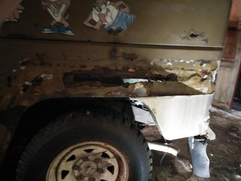 Sitten se savotta vasta alkoi iskemään päälle. Turvakaaren allaolevasta reiästä taskulampulla tuijatessa huomattiin että hieman on koriste peltien alla käyny samat rotat jyrsimässä jotka oli syöny ovien alta palkin pois. Joten ei muutakuin koristeet irti ja tarkistamaan että mitä sieltä löytyy. Korin alaosa oli jossain edellisessä elämässä kierretty kokonaan rosteri helmasarjalla ja pellit oli ruuvattu noin kahdella sadalla ruuvilla kiinni. Ruuvit oli tottakai ruostuneet joten ruuvaamalla ei lähtenyt kuin muutama, loput väännettiin aiai knipexeillä irti. Poraamistakin yritettiin mutta kaikki terät antautui viimeistään toista ruuvia poratessa. Pellit saatiin irti ja sitten se karu totuus pienestä paikantarpeesta paljastui. Molemmilta puolilta kori oli käytännössä ruostunut poikki sisälokareitten kohdalta, Takakulmista ei ollut sen vertaa jäljellä että olisi pellin muotoa saanut ja etuovien alla helmat hävinneet lähestulkoon kokonaan. Ruoste oli syönyt niin pahoin että kori oli tippunut rungon päälle takaosasta ja korin yläosakin oli jo tipahtanut sen verran että jos takimmainen palkki olisi ollut paikoillaan niin takaovet ei varmasti olisi enää toimineet.