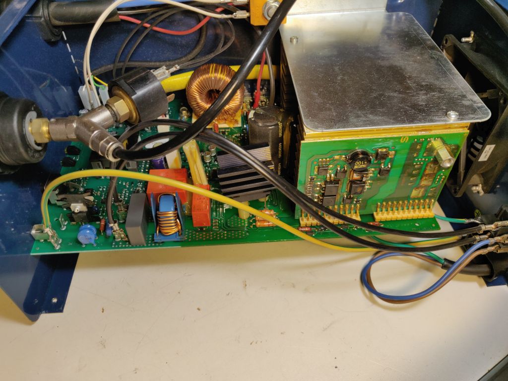 Helppo purkaa. Muuta helppoa tässä ei sitten taida ollakkaan. Laitteeseen ei ole toistaiseksi löytynyt mitään papereita eikä oikein muutakaan tietoa. Joltain brittien hitsausfoorumilta löytyi keskustelua ja näytti olevan samanlainen vika tai ainakin sen jäljet mitä tässä on. No sielläkin ratkaisuksi tarjottiin "elektroniikan vaihtoa".