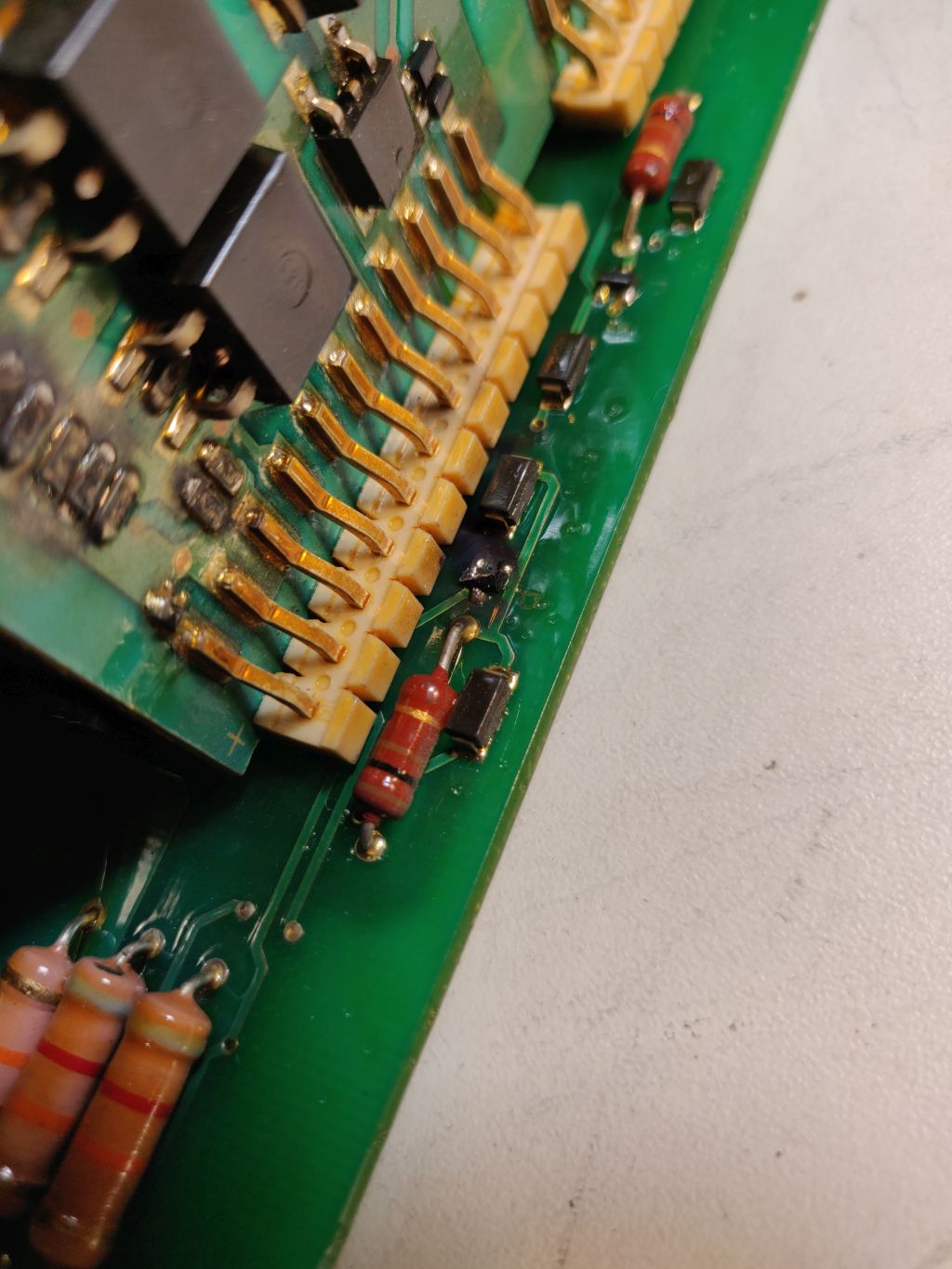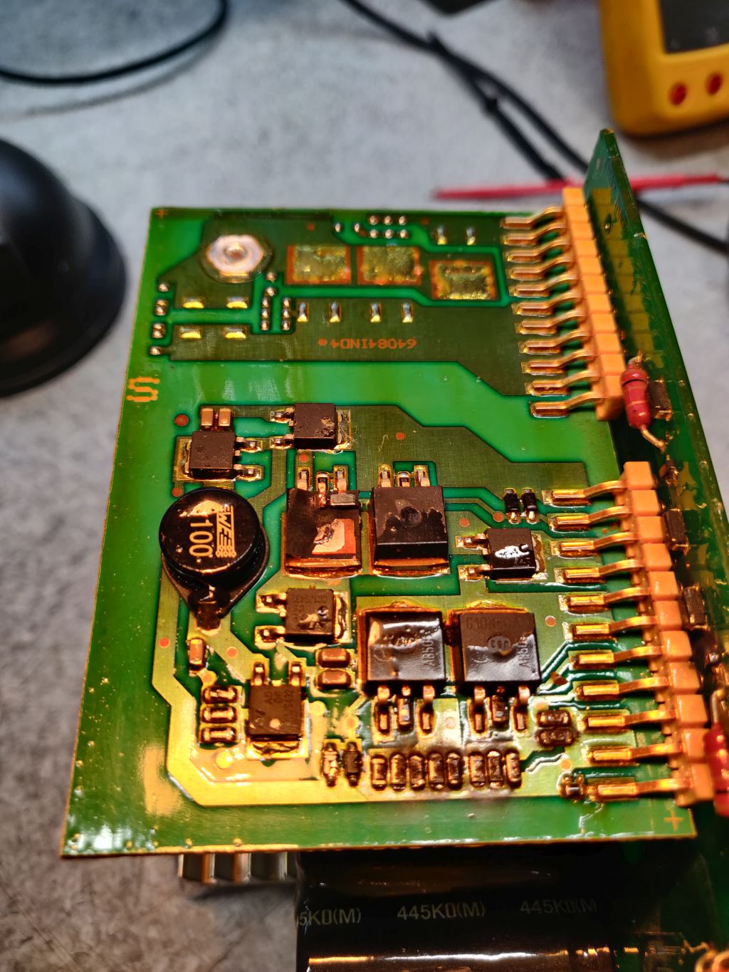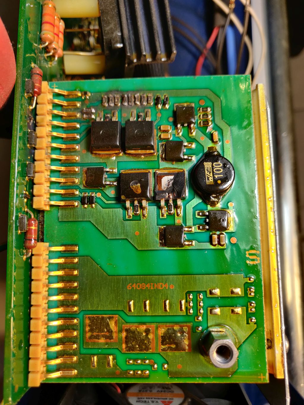 Korjauksen kannalta erityisen vaikea rakenne. Invertterin input- ja output tehoelektroniikka rakennettu alumiinipohjaiselle piirilevyille. Kortit sitten liimattu jäähdytysripoihin. Liimaus kyllä irtosi, mutta tollasessa alumiinilevyssä on niin suuri lämmönjohtavuus, että tavallisilla kolveilla turha yrittää irroittaa mitään tuosta levystä. Lisähaitta vielä, että koko paska kastettu lakkaan mikä ei tunnu liukenevan mihinkään. Ei auta kuin mekaanisesti rapsutella vaihdettavat osat esiin. Tuo lakkakerros vaikeuttaa myös tunnistusta useimmissa nykyosissa kun ne vähätkin merkinnät on poltettu laserilla epoksin pintaan. Lakkakerros päällä tekee merkinnät näkymättömiksi.