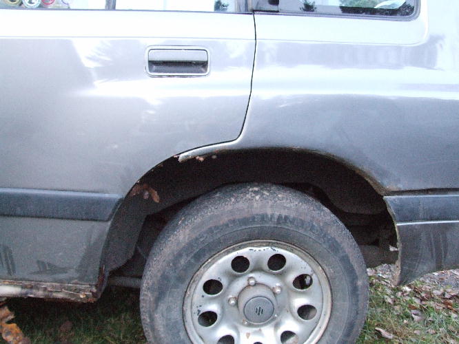Terttuun tehtiin itse peltiä paukuttelemalla tuo helman ja takakaaren kulma. Eihän se uuden veroinen ole, mutta toimii. Jos näkö haittaa, niin pakkelillahan saa aina virheet piilotettua ![]()