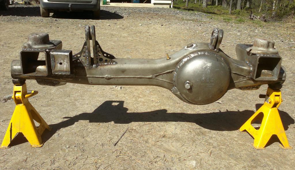 Ekana ajattelin tehdä nuo jousipedit ja iskarin kiinnitykset. Siitä sitten alatukivarsien kiinnikkeiden kimppuun. Budjetti ei anna periks vaihtaa noita Bilsteinin iskareita normaalilla alapäällä oleviin joten Jeepin iskarinkiinnitys tuli kopioitua tuohon uuteenkin. Jos ei tunnu toimivan niin muutetaan sitten. Jousipedit tulee nyt 100x100x5 neliöpalkista + palkin päälle hodarin jousilautanen. Tuossa alustava kuskin puolen jousipeti: Pedit tulee nyt jousien suhteen akseliputken keskelle eikä etupuolelle kuten Jeepin akselissa on vakiona jotta tuo jousi tulee järkevämpään asentoon. Paikalla näkee sitten vieläkö iskarit passaa paikoilleen kun peti on liikkunut taaksepäin... Eli mittasin pinionin kulman ennen Jeepin akselin purkua ja nyt hodarin akseli on 'penkissä' samassa kulmassa kun teen kiinnikkeet alustavasti. Heftaan kaikki paikoilleen ja käytän alla, muutetaan sitten tarvittaessa ennen pysyvästi paikoilleen neulomista. Jos sitä sais huomenna kopioitua samanlaisen vänkärin puolelle, heftaisi ne kiinni ja alkas suunnitteleen niitä alatukivarsien kiinnikkeitä |