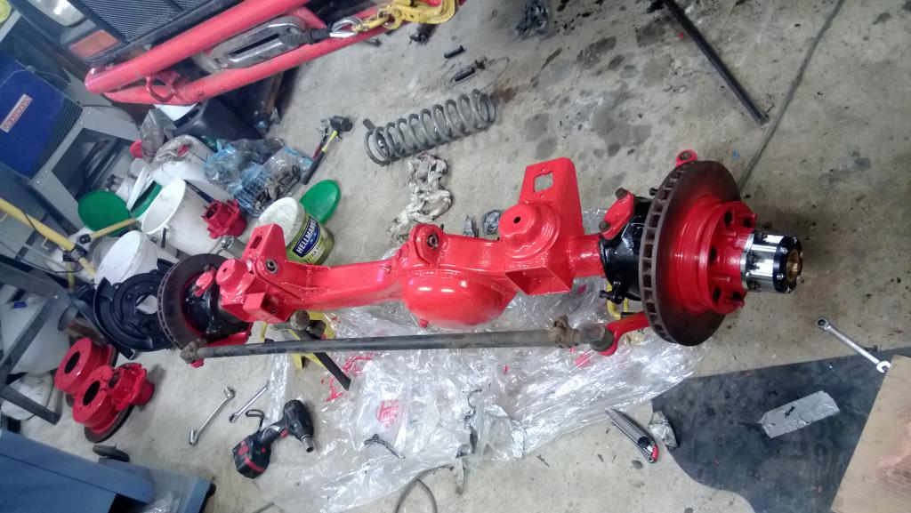 Piti sitten käydä illan päälle vielä etuakseliin ylätukivarsien nivelet kasaamassa paikoilleen ja siinä samalla uittaa akseli Jeepin alle: