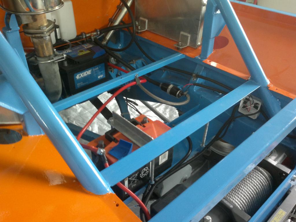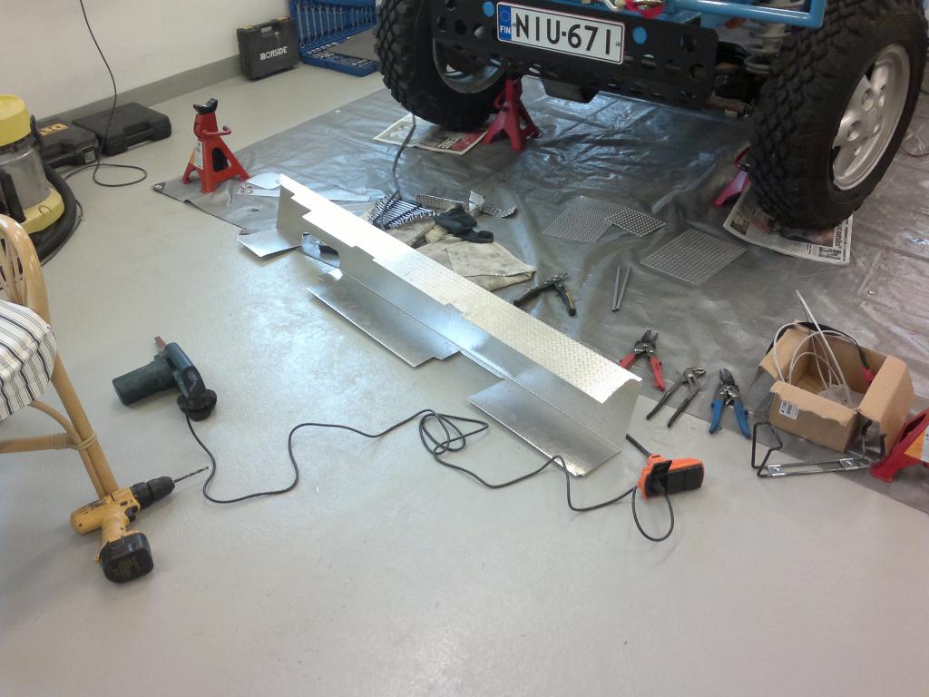 Uutta väriäkin saatu pintaan, rauta sai hieman sinisemmän värin kuin ennen ja koripaneelit päätettiin pitkän pohdinnan jälkeen maalata oranssiksi. Autossa oli hyvät paikat vinsseille, sinne hommattiin Runvan nopeet (eihän se taakse meinannut sopia millään, mutta uudet ruuvinreiät ja mahtu just ja just. Panssaria ohjausvarrelle myös.